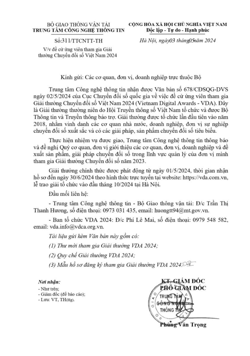 Thông báo về việc đề cử ứng viên tham gia Giải thưởng Chuyển đổi số Việt Nam 2024 08/05/2024 08:05 File đính kèm HO-SO-THAM-DU.pdf QUY-CHE-BINH-CHON.pdf Tin liên quan Thông báo về việc cập nhật thông tin Căn cước công dân cho người phụ thuộc 30/10/2025 Kế hoạch tổ chức Toạ đàm khoa học “Vai trò của Trí tuệ nhân tạo và công nghệ mới trong nâng cao hiệu quả nghiên cứu lĩnh vực tài chính kế toán” 24/10/2025 Thông báo về việc cử cán bộ tham gia khóa bồi dưỡng tại Học viện Ngoại giao 20/10/2025 Về việc lấy ý kiến góp ý vào dự thảo Quyết định ban hành Quy định về công tác thi đua, khen thưởng của Trường Đại học Công nghệ GTVT 09/10/2025 Thông báo về việc thống kê khối lượng hoạt động phục vụ cộng đồng của giảng viên năm học 2024-2025 02/10/2025 Kê khai khối lượng hoạt động khoa học và công nghệ phục vụ thanh toán khối lượng thừa giờ năm học 2024-2025 01/10/2025