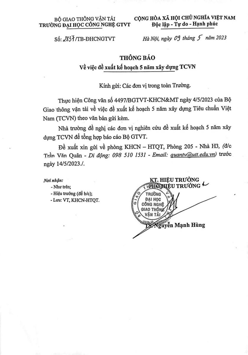 Thông báo về việc đề xuất kế hoạch 5 năm xây dựng TCVN 10/05/2023 14:05 File đính kèm 4497-BGTVT-KHCN-MT-519.pdf 4497-BGTVT-KHCN-MT-519--TIEP-.pdf Tin liên quan Thông báo về việc cập nhật thông tin Căn cước công dân cho người phụ thuộc 30/10/2025 Kế hoạch tổ chức Toạ đàm khoa học “Vai trò của Trí tuệ nhân tạo và công nghệ mới trong nâng cao hiệu quả nghiên cứu lĩnh vực tài chính kế toán” 24/10/2025 Thông báo về việc cử cán bộ tham gia khóa bồi dưỡng tại Học viện Ngoại giao 20/10/2025 Về việc lấy ý kiến góp ý vào dự thảo Quyết định ban hành Quy định về công tác thi đua, khen thưởng của Trường Đại học Công nghệ GTVT 09/10/2025 Thông báo về việc thống kê khối lượng hoạt động phục vụ cộng đồng của giảng viên năm học 2024-2025 02/10/2025 Kê khai khối lượng hoạt động khoa học và công nghệ phục vụ thanh toán khối lượng thừa giờ năm học 2024-2025 01/10/2025
