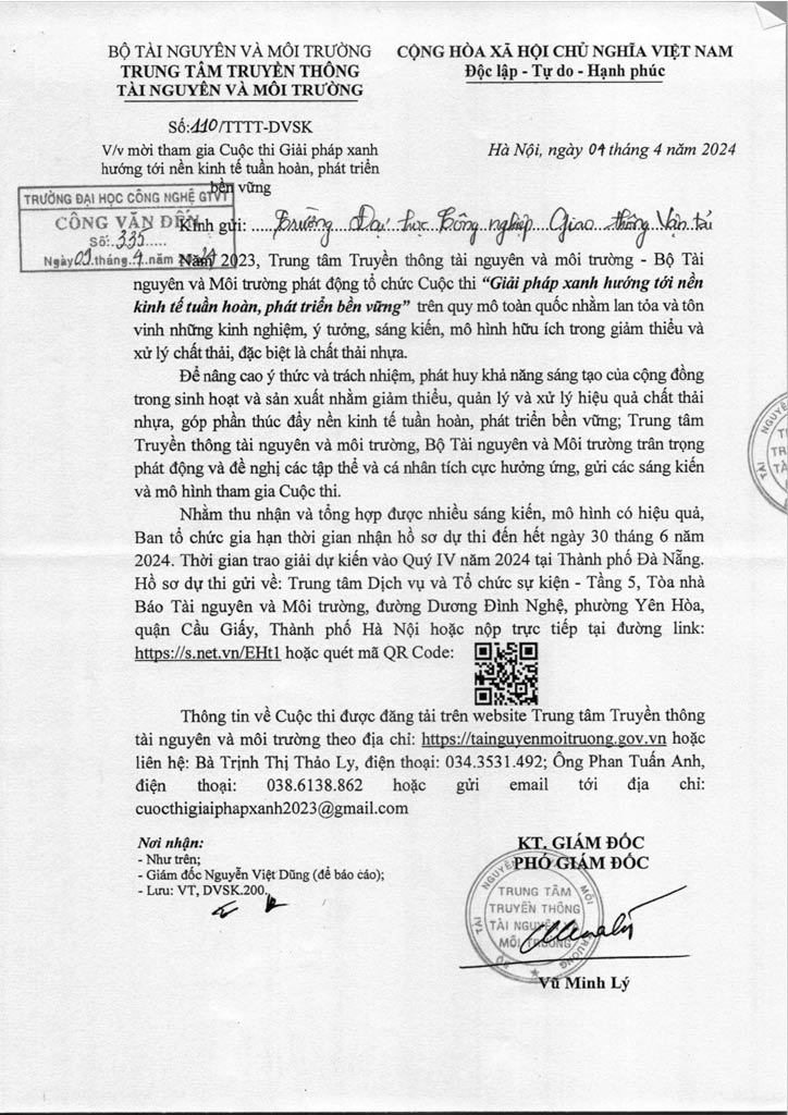 Thông báo về việc mời tham gia Cuộc thi Giải pháp xanh hướng tới nền kinh tế tuần hoàn, phát triển bền vững 10/04/2024 14:04 File đính kèm cuoc-thi-giai-phap-xanh.pdf