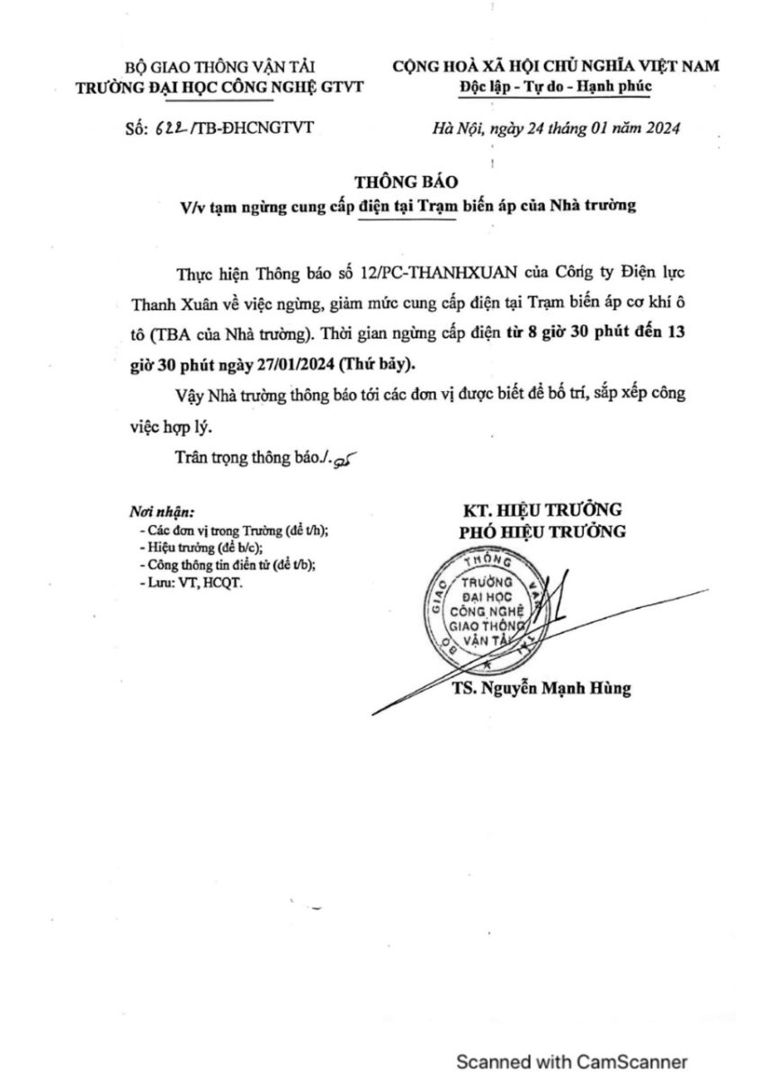 Thông báo về việc tạm ngừng cung cấp điện tại Trạm biến áp của Nhà trường