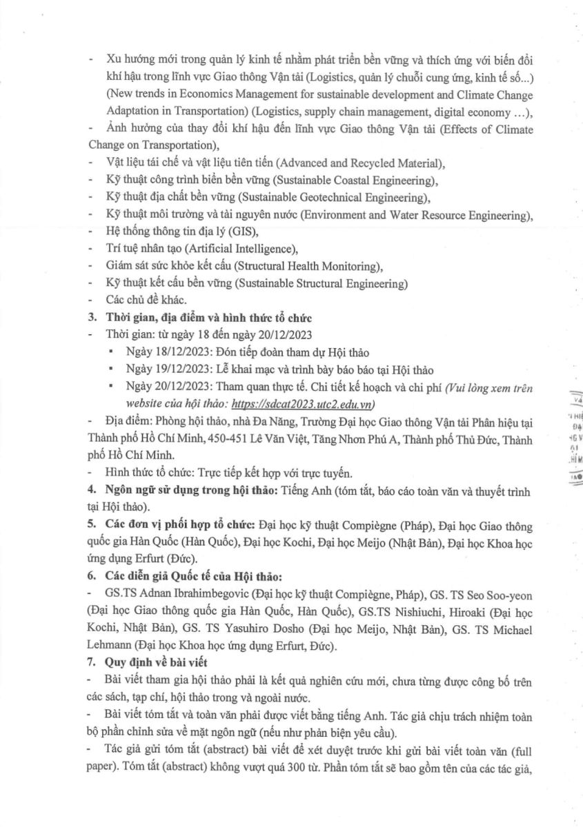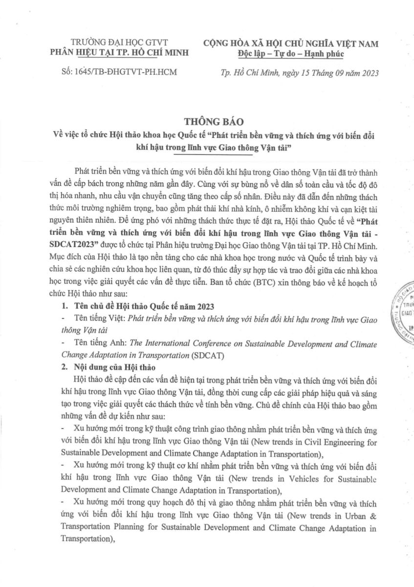 Thông báo về việc tổ chức Hội thảo khoa học Quốc tế: Phát triển bền vững và thích ứng với biến đổi khí hậu trong lĩnh vực GTVT 26/09/2023 13:09