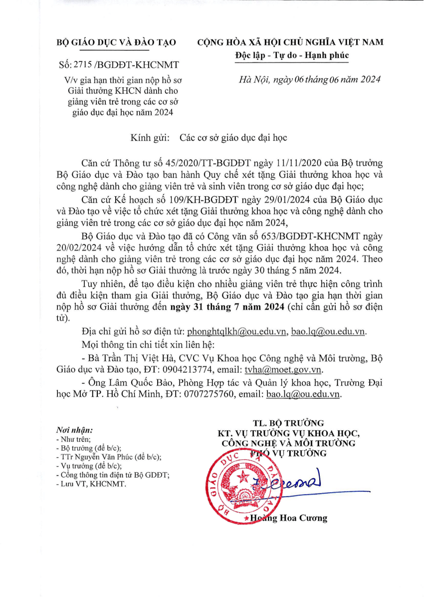 Thông báo v/v gia hạn thời gian nộp hồ sơ Giải thưởng KHCN dành cho giảng viên trẻ trong các CSGD đại học năm 2024 10/06/2024 08:06 File đính kèm 69104-1708510018-654-BGD--T-KHCNMT-153.pdf