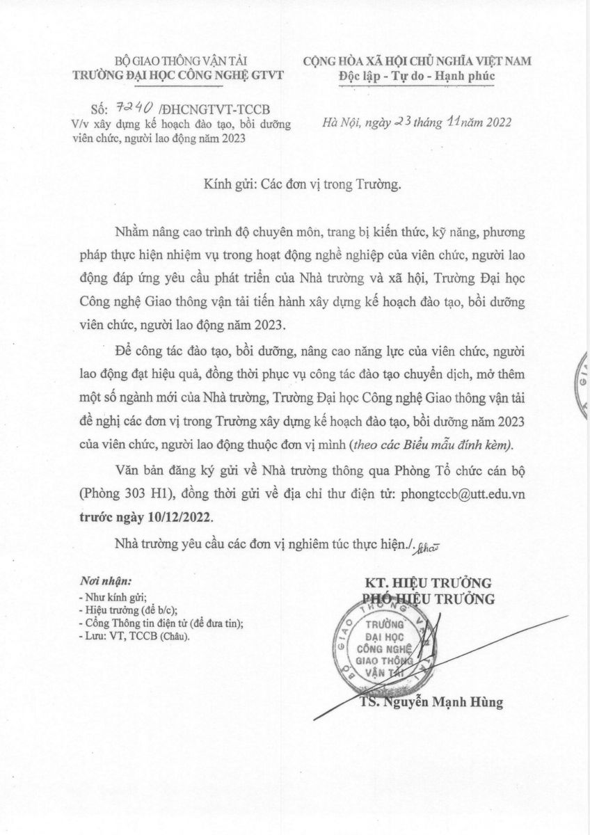 Thông báo xây dựng kế hoạch đào tạo, bồi dưỡng viên chức, người lao động năm 2023 23/11/2022 18:11 File đính kèm Bieu-mau-Ke-hoach-dao-tao-Boi-duong-nam-2022.xls 7240-Xay-dung-ke-hoach-dao-tao-Boi-duong-Vien-chuc-Nguoi-lao-dong-nam-2023.pdf Tin liên quan Thông báo về việc cập nhật thông tin Căn cước công dân cho người phụ thuộc 30/10/2025 Kế hoạch tổ chức Toạ đàm khoa học “Vai trò của Trí tuệ nhân tạo và công nghệ mới trong nâng cao hiệu quả nghiên cứu lĩnh vực tài chính kế toán” 24/10/2025 Thông báo về việc cử cán bộ tham gia khóa bồi dưỡng tại Học viện Ngoại giao 20/10/2025 Về việc lấy ý kiến góp ý vào dự thảo Quyết định ban hành Quy định về công tác thi đua, khen thưởng của Trường Đại học Công nghệ GTVT 09/10/2025 Thông báo về việc thống kê khối lượng hoạt động phục vụ cộng đồng của giảng viên năm học 2024-2025 02/10/2025 Kê khai khối lượng hoạt động khoa học và công nghệ phục vụ thanh toán khối lượng thừa giờ năm học 2024-2025 01/10/2025