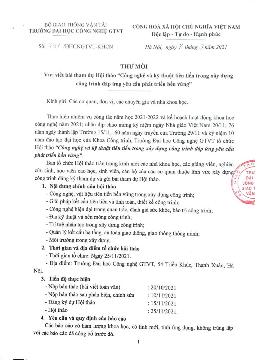 Thực hiện nhiệm vụ công tác năm học 2021-2022 và kế hoạch hoạt động khoa học công nghệ năm 2021; nhân dịp chào mừng kỷ niệm ngày Nhà giáo Việt Nam 20/11, 76 năm ngày thành lập Trường 15/11, 60 năm ngày truyền thống của Trường 29/11 và kỷ niệm 10 năm đào tạo đại học của Khoa Công trình, Trường Đại học Công nghệ GTVT tổ chức Hội thảo “Công nghệ và kỹ thuật tiên tiến trong xây dựng công trình đáp ứng yêu cầu phát triển bền vững”.