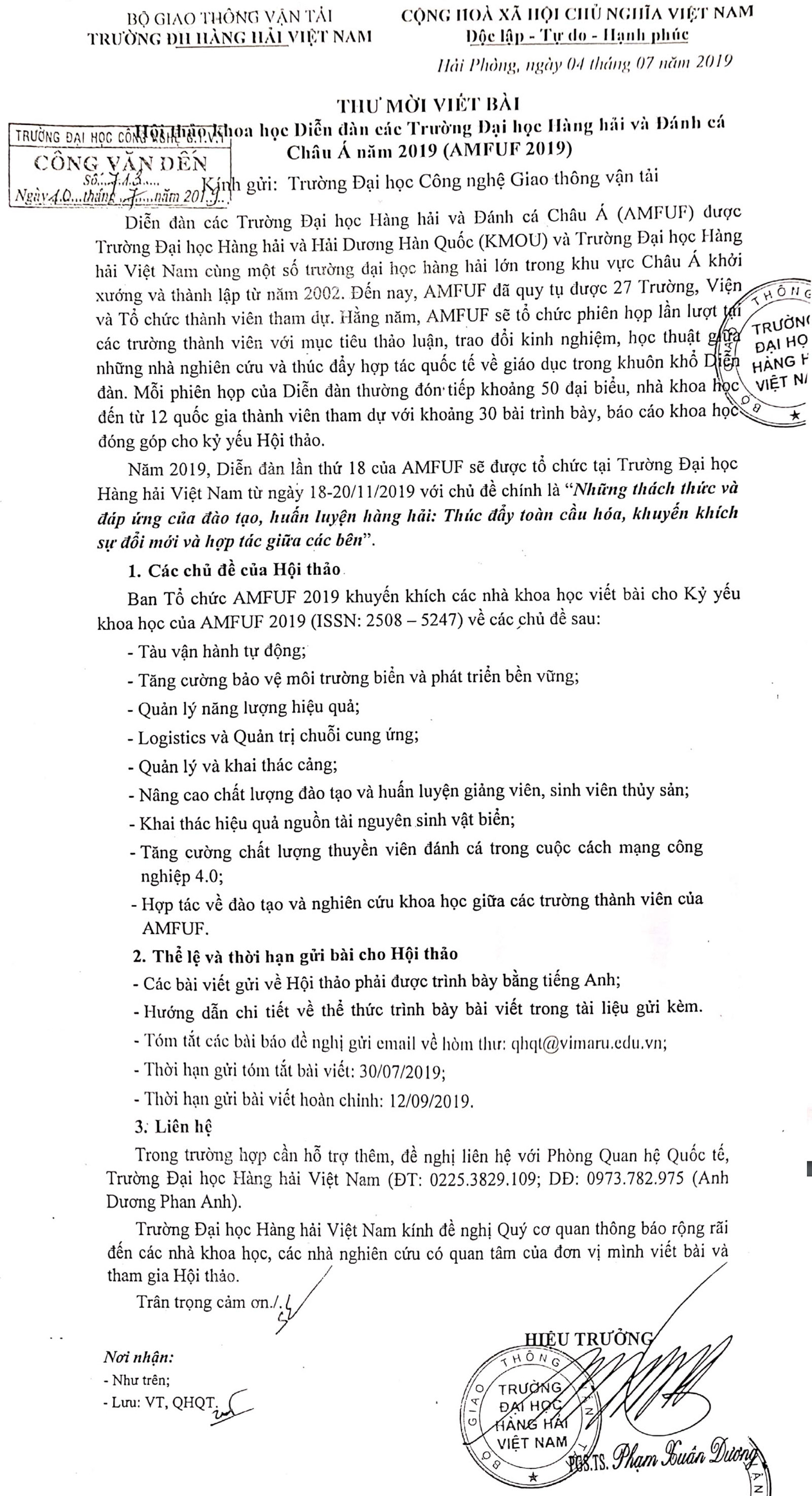 Thư mời viết bài Hội thảo khoa học Diễn đàn các Trường Đại học Hàng hải và Đánh cá Châu Á năm 2019 (AMFUF 2019) 12/07/2019 16:07