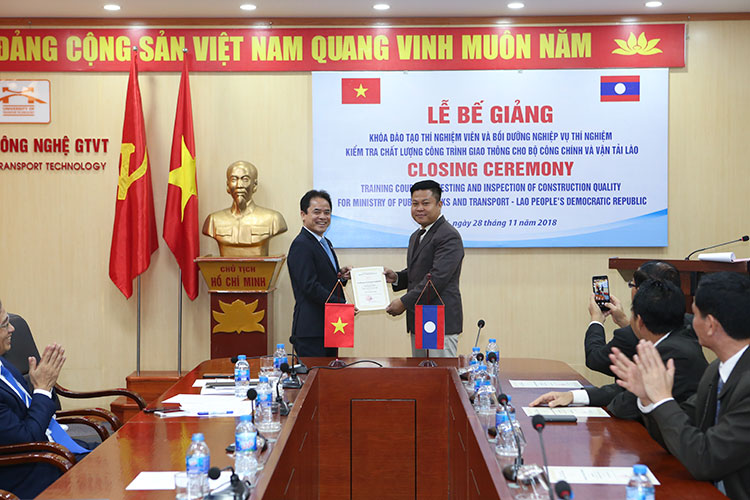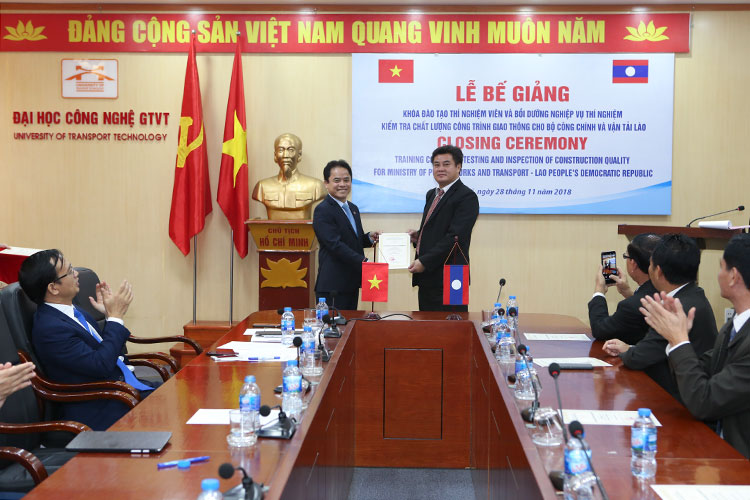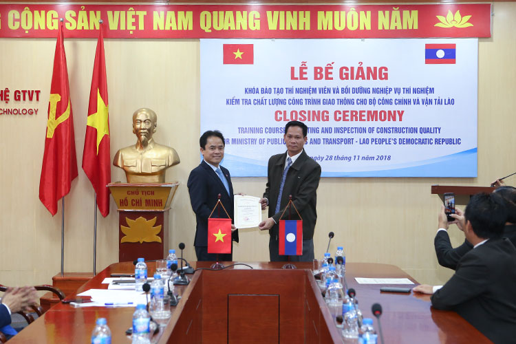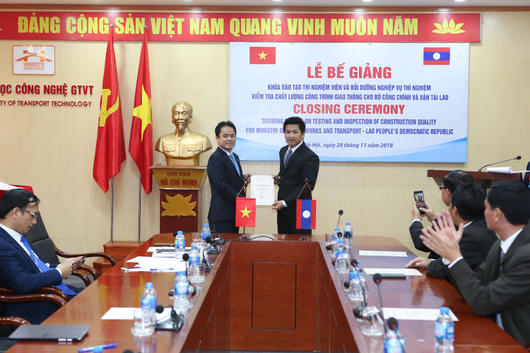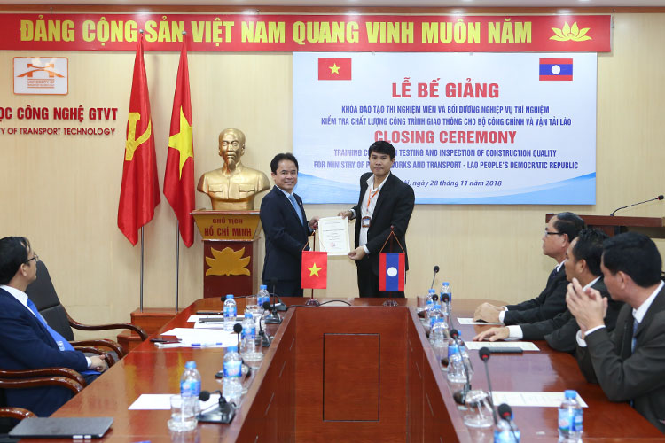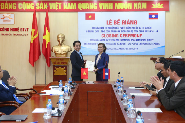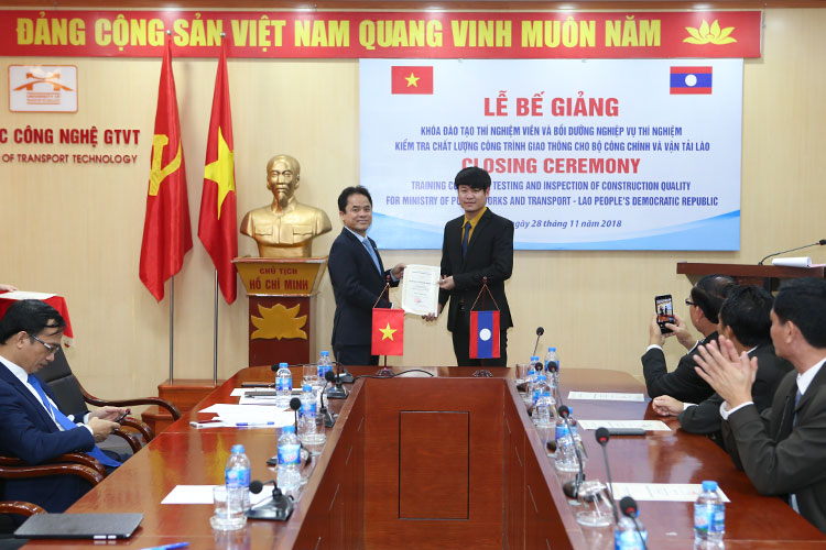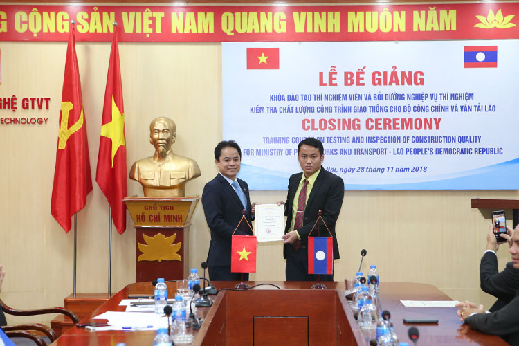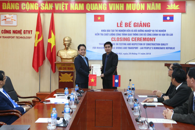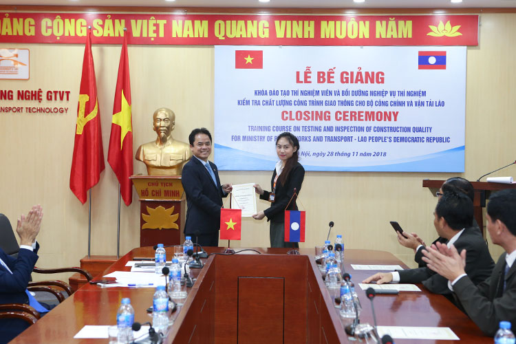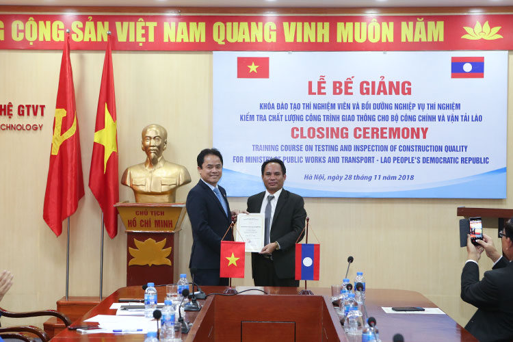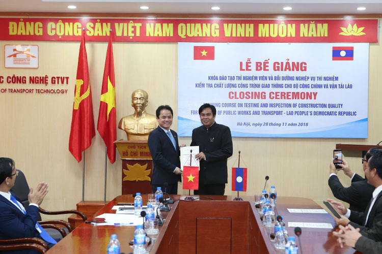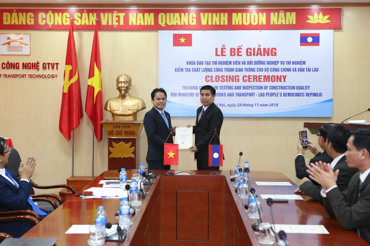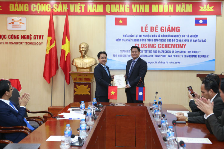 Ngày 28/11/2018, Trường Đại học Công nghệ Giao thông vận tải đã tổ chức Lễ Bế giảng khóa đào tạo thí nghiệm viên và bồi dưỡng nghiệp vụ thí nghiệm kiểm tra chất lượng công trinh cho 15 cán bộ đến từ Bộ Công chính và Vận tải Lào.