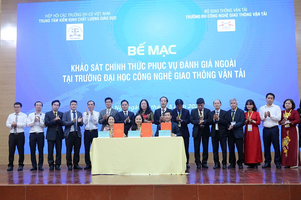 Kết thúc Lễ bế mạc, đại diện Lãnh đạo Nhà trường, đại diện Trung tâm Kiểm định chất lượng giáo dục và Đoàn đánh giá ngoài đã ký biên bản hoàn thành đợt Đánh giá ngoài tại Trường Đại học Công nghệ Giao thông vận tải.