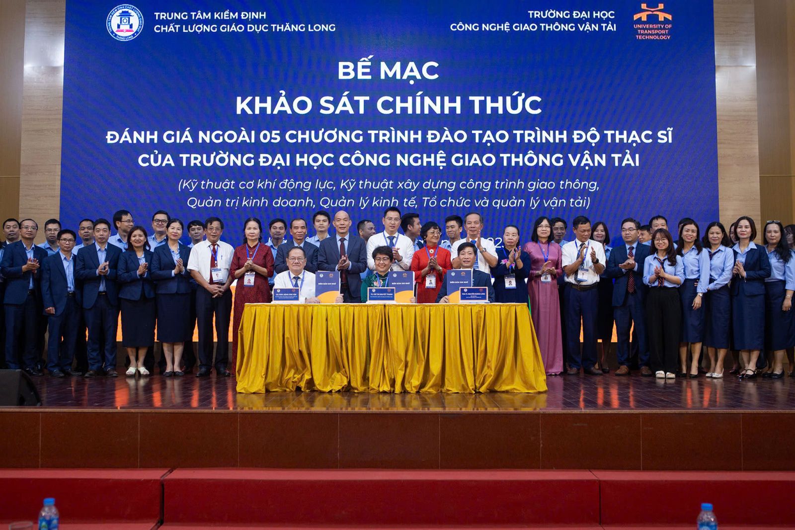 Kết thúc chương trình, đại diện Trung tâm KĐCLGD Thăng Long, Đoàn chuyên gia và Hiệu trưởng Trường Đại học Công nghệ GTVT đã ký biên bản hoàn thành đợt khảo sát chính thức đánh giá chất lượng 05 CTĐT trình độ thạc sĩ.