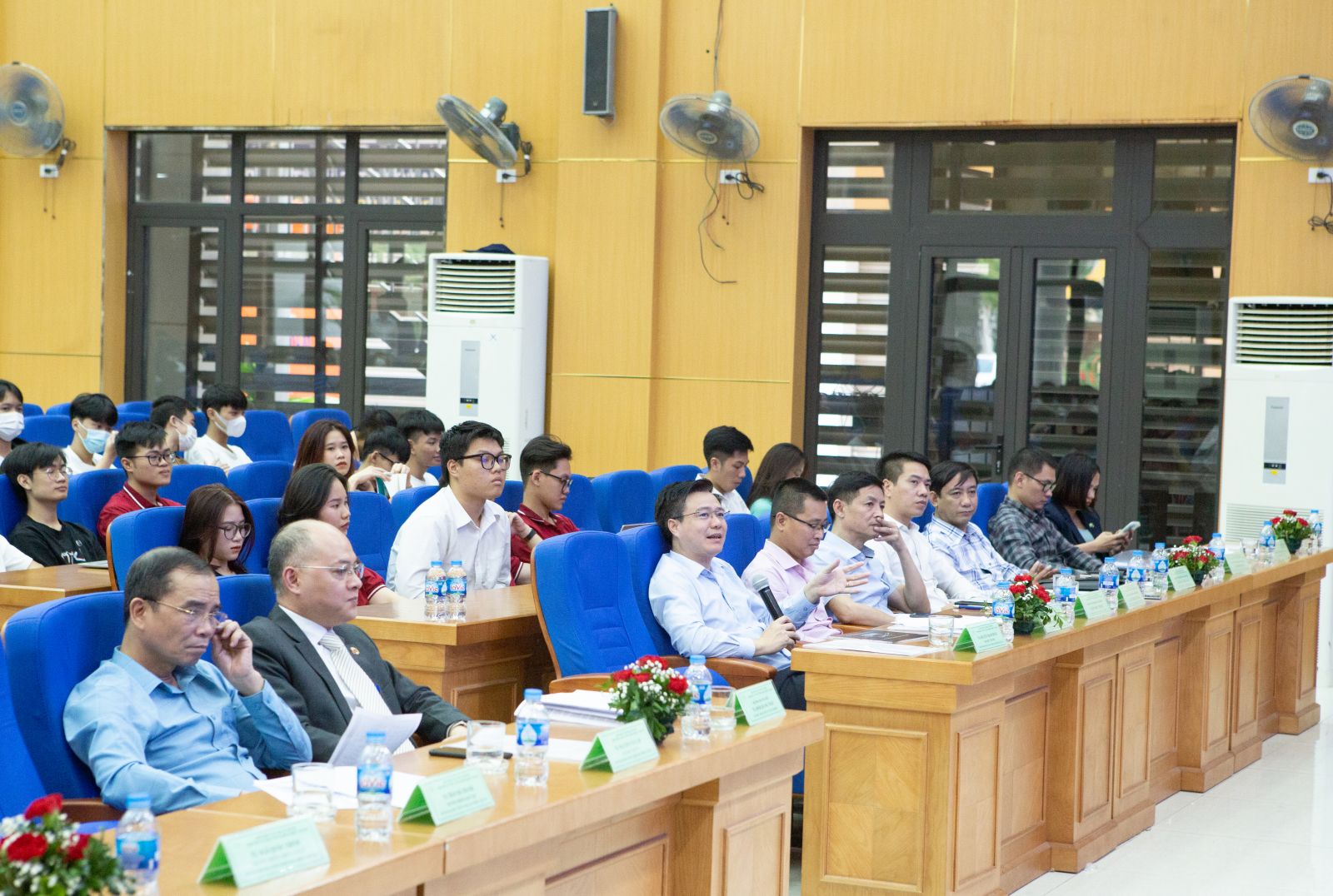 Lãnh đạo các Phòng ban/Khoa, bộ môn, giảng viên trong Trường, cùng GVHD: TS. Trần Hà Thanh - Trưởng phòng Đào tạo; TS. Ngô Quốc Trinh - Trưởng phòng KHCN&HTQT; TS. Ngô Thị Thu Hương - Trưởng Khoa Công trình; TS. Hoàng Thị Hồng Lê - Trưởng Khoa KTVT; TS. Nguyễn Quang Anh - Trưởng Khoa Cơ khí; PGS.TS. Đỗ Quang Hưng - Trưởng Khoa CNTT; TS. Trần Quốc Tuấn - Trưởng Khoa KH-ƯD