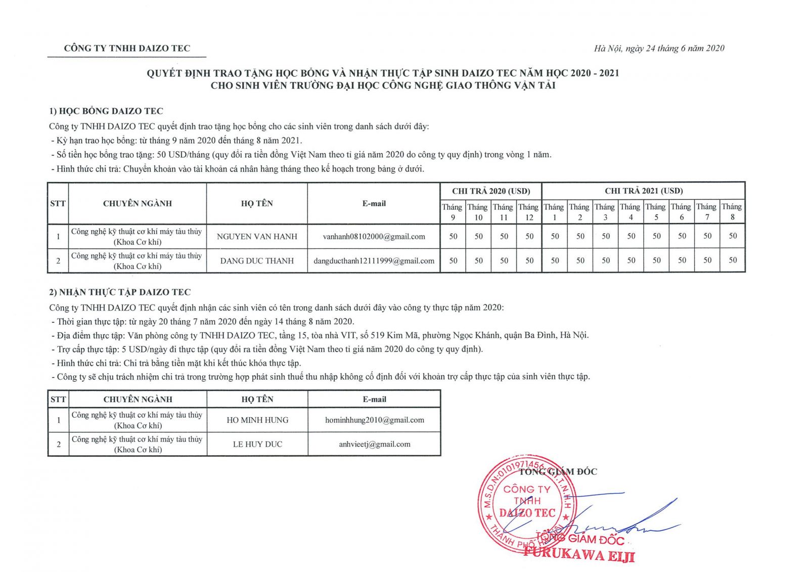 Quyết định trao tặng học bổng và nhận thực tập sinh năm học 2020 – 2021 của Công ty DAIZO TEC