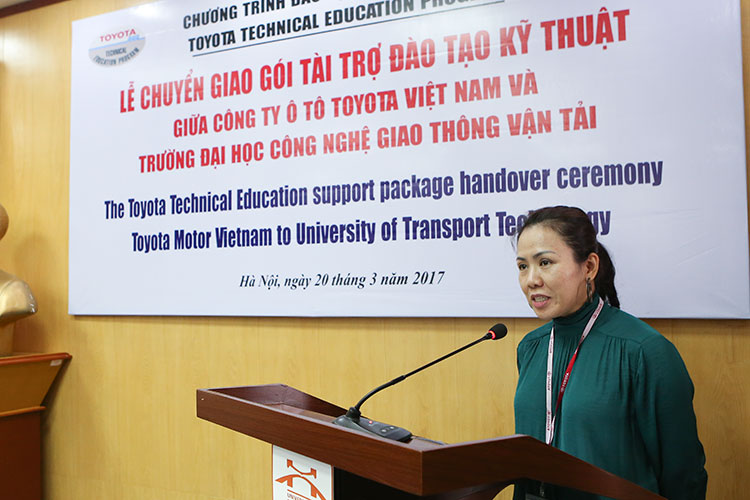 Tại buổi lễ, bà Đỗ Thu Hoàng - Phó Tổng giám đốc Công ty Toyota Việt Nam (TMV) cho biết Trường Đại học Công nghệ GTVT là Trường đầu tiên của Việt Nam tham gia Chương trình đào tạo kỹ thuật của Toyota (từ năm 2000) và Trường đã đào tạo thành công khoảng 450 kỹ thuật viên ô tô, trong đó có hơn 80 học viên tốt nghiệp đã được tuyển dụng ngay vào hệ thống đại lý của Toyota. Với gói tài trợ đào tạo kỹ thuật ngày hôm nay, bà Đỗ Thu Hoàng tin rằng công tác đào tạo và học tập tại Trường Đại học Công nghệ GTVT sẽ tiếp tục được nâng cao hơn nữa không chỉ về kiến thức lý thuyết, mà cả trong hoạt động thực hành đáp ứng mục tiêu đào tạo theo hướng ứng dụng công nghệ của Trường.