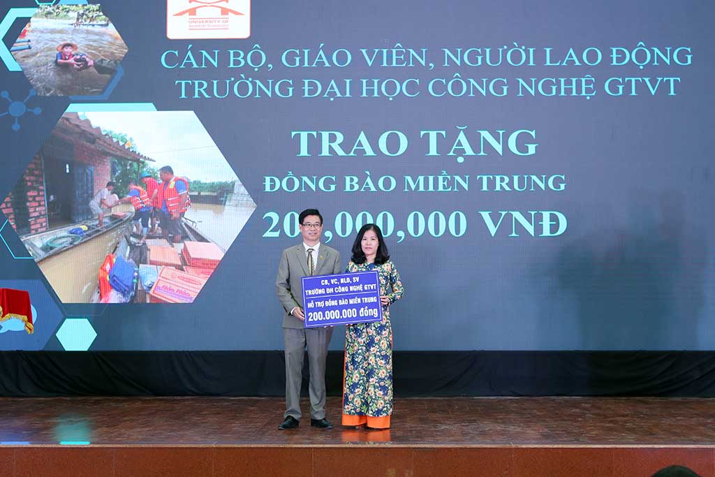 Tập thể Trường Đại học Công nghệ GTVT chia sẻ khó khăn với đồng bào miền Trung bị thiệt hại do mưa bão gây ra.