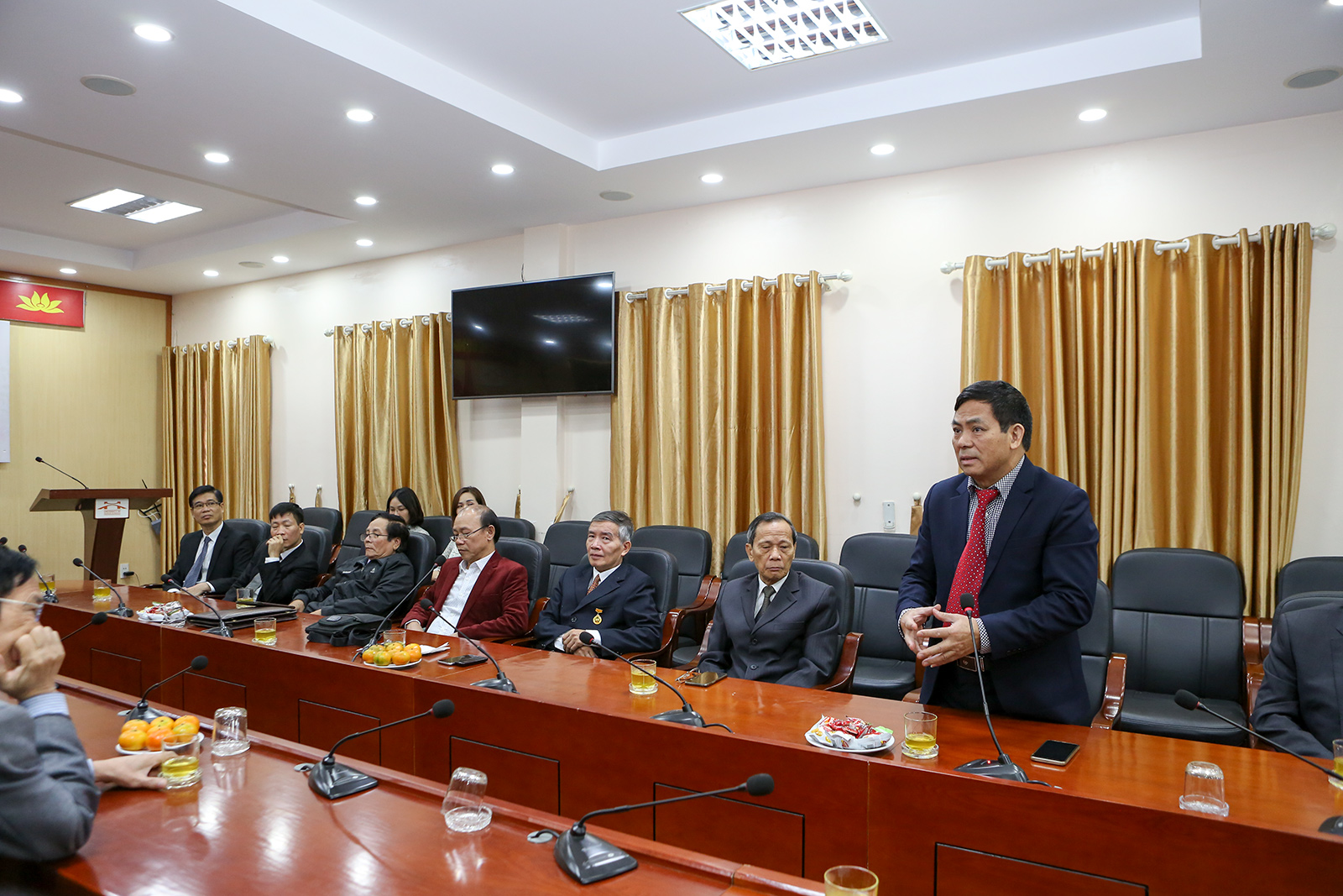 Mở đầu buổi gặp mặt, PGS.TS. Đào Văn Đông - Hiệu trưởng Nhà trường đã báo cáo các thông tin chung về hoạt động của Trường Đại học Công nghệ GTVT trong năm học vừa qua. Qua đó, PGS.TS. Đào Văn Đông đánh giá rất cao sự đóng góp của các chuyên gia, các nhà giáo trong mọi hoạt động của Nhà trường, và mong muốn các chuyên gia, các nhà giáo tiếp tục phát huy hết kiến thức, kinh nghiệm để góp phần đẩy mạnh hơn nữa công tác đào tạo, giảng dạy và nghiên cứu khoa học của Nhà trường trong thời gian tiếp theo. Cuối cùng, PGS.TS. Đào Văn Đông thay mặt tập thể sư phạm Nhà trường chúc mừng các thầy giáo, các Nhà khoa học nhân dịp ngày Nhà giáo Việt Nam; Nhà trường luôn mong muốn các thầy thường xuyên, liên tục có hỗ trợ, định hướng, trực tiếp đào tạo đội ngũ lãnh đạo, nhà khoa học trẻ phát triển, nâng cao trình độ và năng lực.
