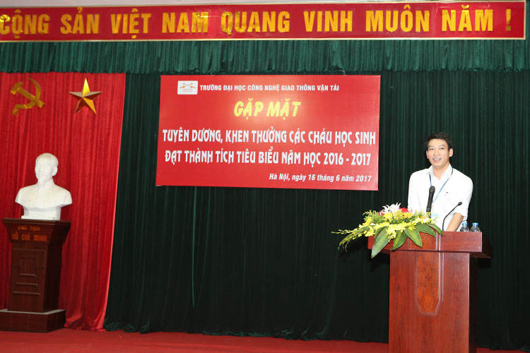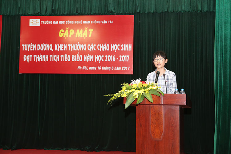 Đại diện cho toàn thể học sinh nhận thưởng tại buổi lễ, em Võ Xuân Mai đã bày tỏ tình cảm, sự biết ơn sâu sắc của mình đối với công ơn dạy dỗ của cha mẹ và sự quan tâm, động viên khuyến khích của Đảng ủy, Ban Giám hiệu và Ban chấp hành Công đoàn Trường Đại học Công nghệ GTVT, đồng thời hứa cố gắng phần đấu chăm ngoan, học tốt và gặt hái nhiều thành tích hơn nữa trong năm học mới.
