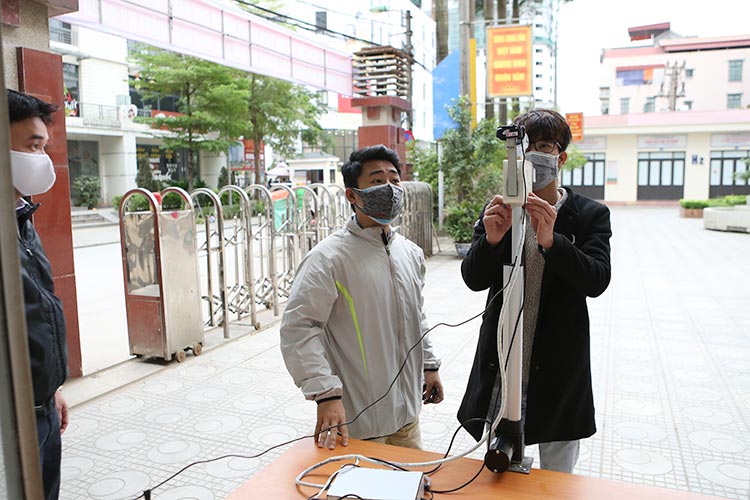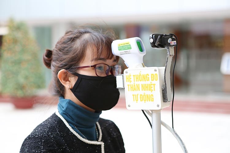 Hệ thống đo thân nhiệt tự động được nhóm thiết kế sau khi tham khảo sáng chế của nhóm nghiên cứu của GS.TSKH Bùi Văn Ga. Hệ thống cho phép tự động kích hoạt đo thân nhiệt của người đứng trước máy ở cự ly dưới 5 cm, toàn bộ thông tin ghi nhận trên màn hình máy đo sẽ được gửi qua camera về máy tính của bộ phận kiểm soát, giúp phát hiện kịp thời các trường hợp người ra, vào trường có thân nhiệt bất thường. Hệ thống cho phép tự động tăng, giảm chiều cao nhờ cơ cấu nâng hạ bằng xilanh điện để thích nghi với từng người được kiểm tra, đồng thời tránh tiếp xúc trực tiếp giữa nhân viên y tế với người được kiểm tra thân nhiệt. Các thiết bị và vật tư sử dụng để chế tạo đều sẵn có trên thị trường. Sau bước đầu thử nghiệm thành công, cho kết quả chính xác, nhóm nghiên cứu đang tiếp tục hoàn thiện và nâng cấp hệ thống để có thể nhận diện mặt và tự động lưu dữ liệu đo được vào file datalog.