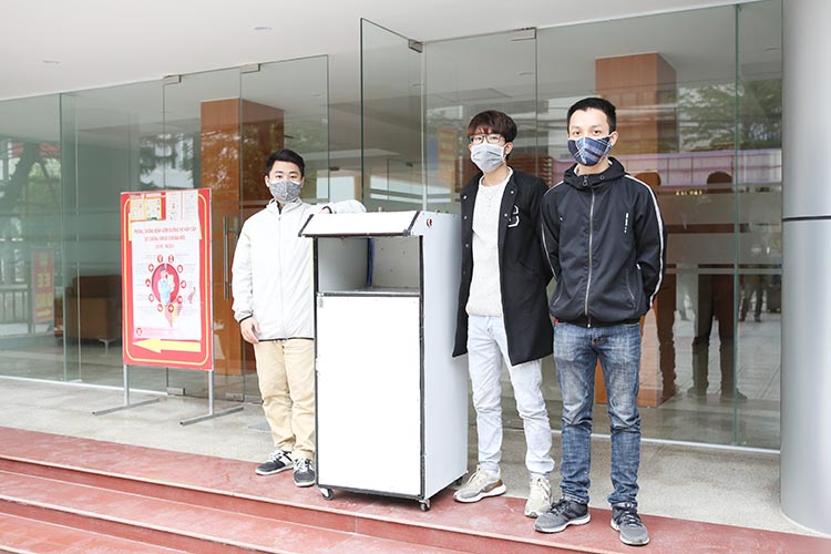 Các sinh viên tham gia nhóm nghiên cứu bên máy sát khuẩn tự động
