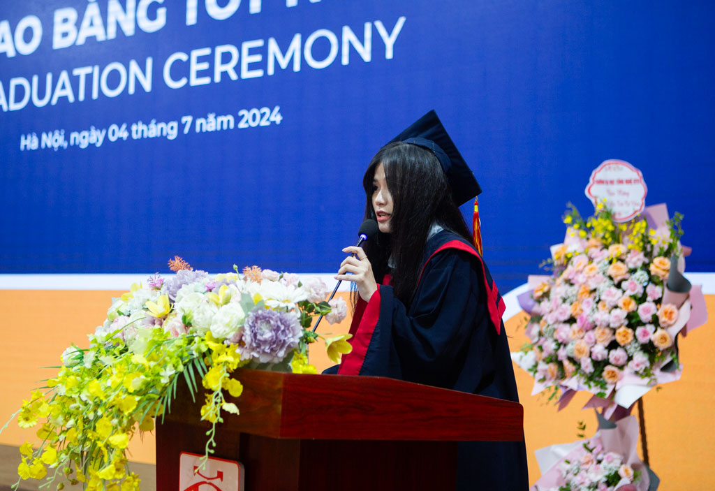 Em Ngô Thị Thương, sinh viên lớp 71DCMO21, Khoa Khoa học ứng dụng, đại diện sinh viên tốt nghiệp lên phát biểu cảm tưởng