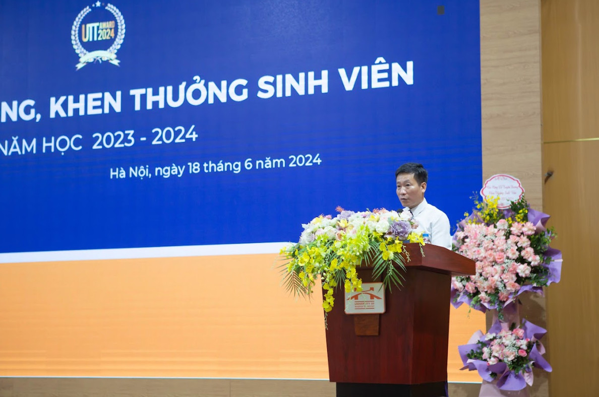 Phát biểu tại buổi Lễ, PGS.TS. Nguyễn Hoàng Long - Hiệu trưởng Nhà trường nhấn mạnh, trong năm học 2023-2024 đã đánh dấu bước ngoặt quan trọng trong công tác dạy và học của Nhà trường. Đây không chỉ là kết quả sự cố gắng của đội ngũ giảng viên, sinh viên, cán bộ UTT mà còn là sự quan tâm hỗ trợ của doanh nghiệp, sự tạo điều kiện của gia đình, người thân các em. Hy vọng rằng trong thời gian tới, các quý doanh nghiệp sẽ tiếp tục đồng hành cùng Nhà trường trong công tác đào tạo và lựa chọn ra những nhân sự chất lượng cao về công tác tại đơn vị mình; các quý phụ huynh hãy luôn là chỗ dựa vững chắc, luôn sát sao để chỉ bảo, động viên con em phấn đấu trong học tập và rèn luyện. Gửi lời động viên đến các em sinh viên, PGS.TS. Nguyễn Hoàng Long nhấn mạnh, các em hoàn toàn có thể tự hào về những gì đã đạt được, chính sự nhiệt huyết, đam mê sáng tạo của các em đã thắp lửa và duy trì giá trị thương hiệu của Trường Đại học Công nghệ GTVT như ngày hôm nay. Hãy tiếp tục học tập, cống hiến và chinh phục mọi khó khăn thử thách, đó chính là con đường để các em tỏa sáng và thành công trên con đường lập nghiệp.