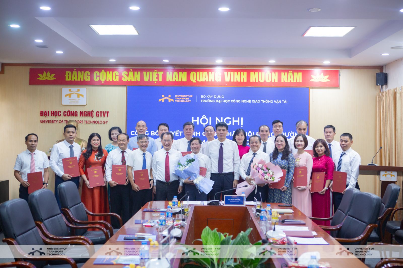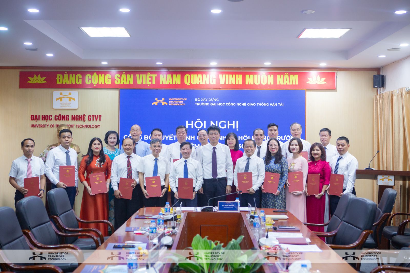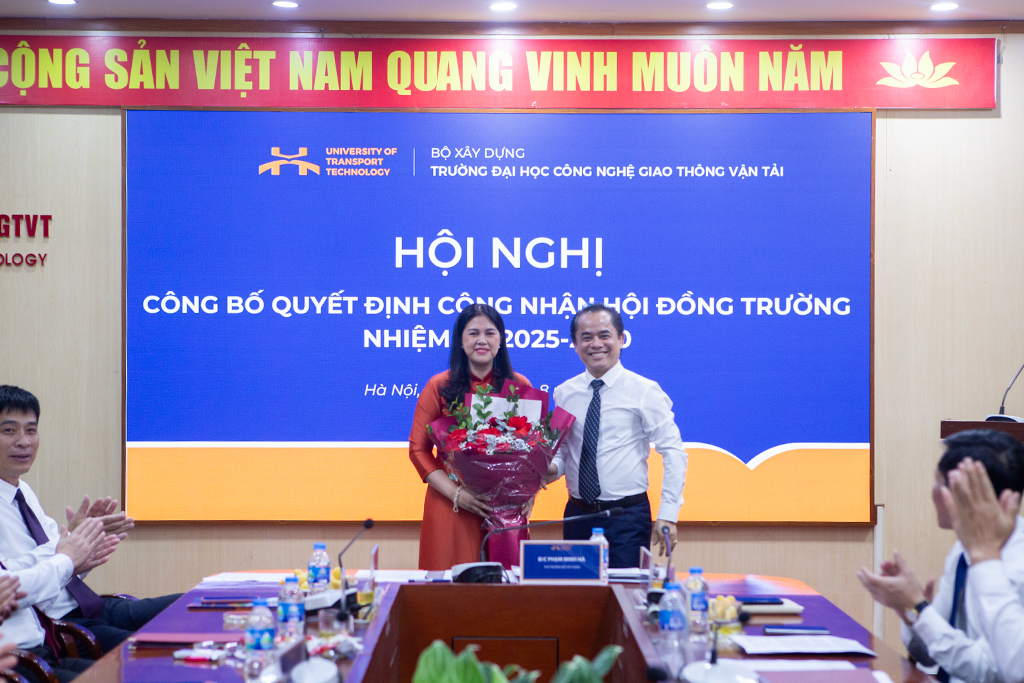 Tại Hội nghị, đồng chí Nguyễn Văn Nghĩa – Phó Vụ trưởng Vụ Tổ chức cán bộ (Bộ Xây dựng) đã công bố Quyết định của Bộ trưởng Bộ Xây dựng về việc công nhận Hội đồng trường Trường Đại học Công nghệ GTVT nhiệm kỳ 2025-2030 gồm 23 thành viên và công nhận Chủ tịch Hội đồng trường là PGS.TS. Vũ Ngọc Khiêm. Ngay sau đó, Thứ trưởng Bộ Xây dựng Phạm Minh Hà đã trao Quyết định công nhận Hội đồng trường và Chủ tịch Hội đồng trường, đồng thời tặng hoa chúc mừng Nhà trường.