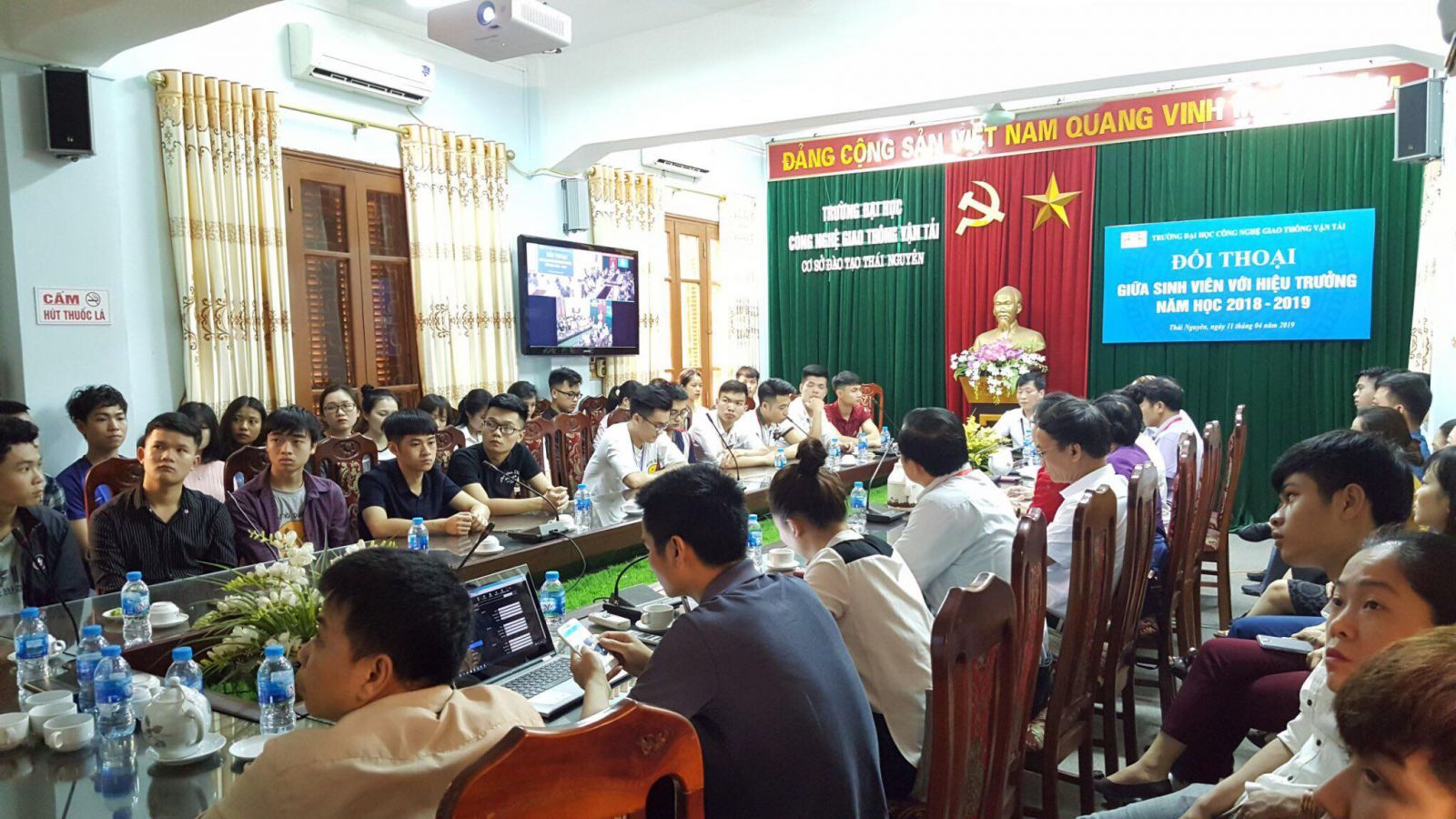 Chiều ngày 11/4/2019, Trường Đại học Công nghệ GTVT tổ chức Hội nghị trực tuyến 3 cơ sở đào tạo “Đối thoại giữa sinh viên với Hiệu trưởng năm học 2018 – 2019”. Đến dự Hội nghị đối thoại trực tuyến có PGS.TS. Đào Văn Đông - Bí thư Đảng ủy, Hiệu trưởng Nhà trường; PGS.TS. Vũ Ngọc Khiêm - Phó Bí thư Đảng ủy, Phó Hiệu trưởng Nhà trường; PGS.TS. Nguyễn Hoàng Long - Phó Bí thư Đảng ủy, Phó Hiệu trưởng Nhà trường; Đồng chí Cao Công Ánh – Bí thư Đoàn TNCS Hồ Chí Minh. Tới dự Hội nghị còn có các đồng chí trong BCH Đảng ủy, BCH Công đoàn; BCH Đoàn thanh niên – Hội sinh viên; Các thầy cô là lãnh đạo các phòng, khoa, trung tâm và các đơn vị chức năng trong trường; các thầy cô GVCN – CVHT và đông đảo các bạn sinh viên đại diện cho các lớp đang học tập tại 3 cơ sở đào tạo.