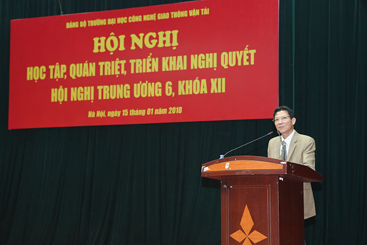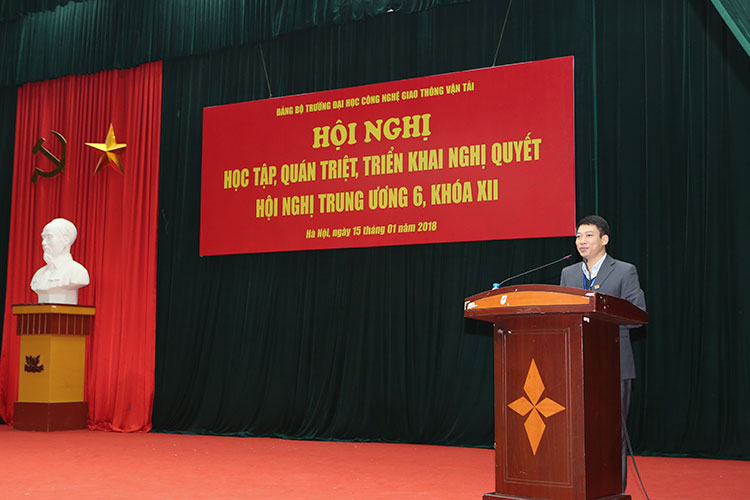 Ngày 15/01/2018, Đảng ủy Trường Đại học Công nghệ GTVT tổ chức buổi học tập, quán triệt và triển khai thực hiện Nghị quyết Hội nghị lần thứ sáu BCH Trung ương (khóa XII), giúp cho toàn thể cán bộ, đảng viên, viên chức, người lao động và sinh viên của Nhà trường nắm vững nội dung cơ bản, những quan điểm và các giải pháp được nêu trong các nghị quyết Hội nghị trung ương 6, khóa XII của Đảng.