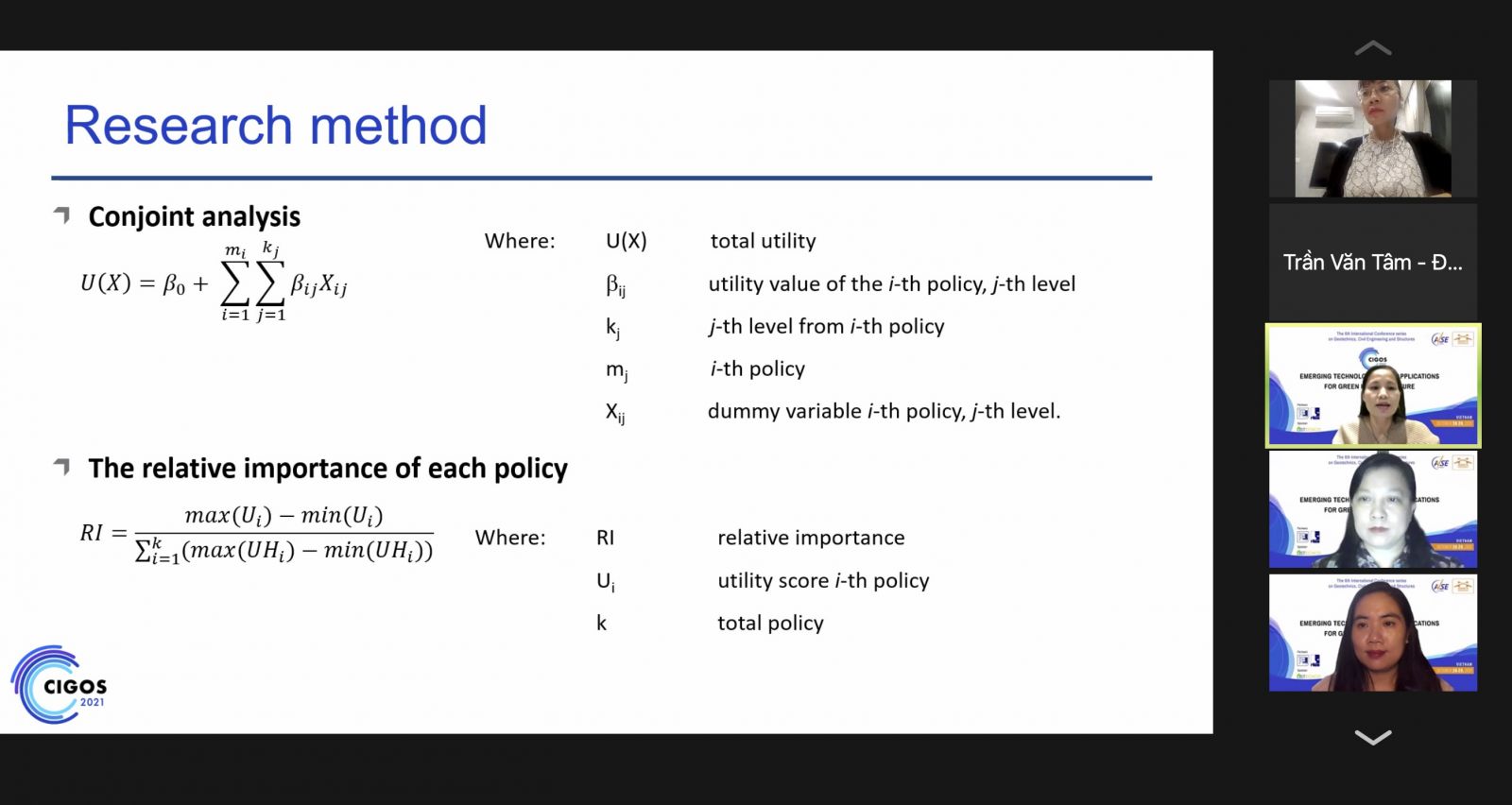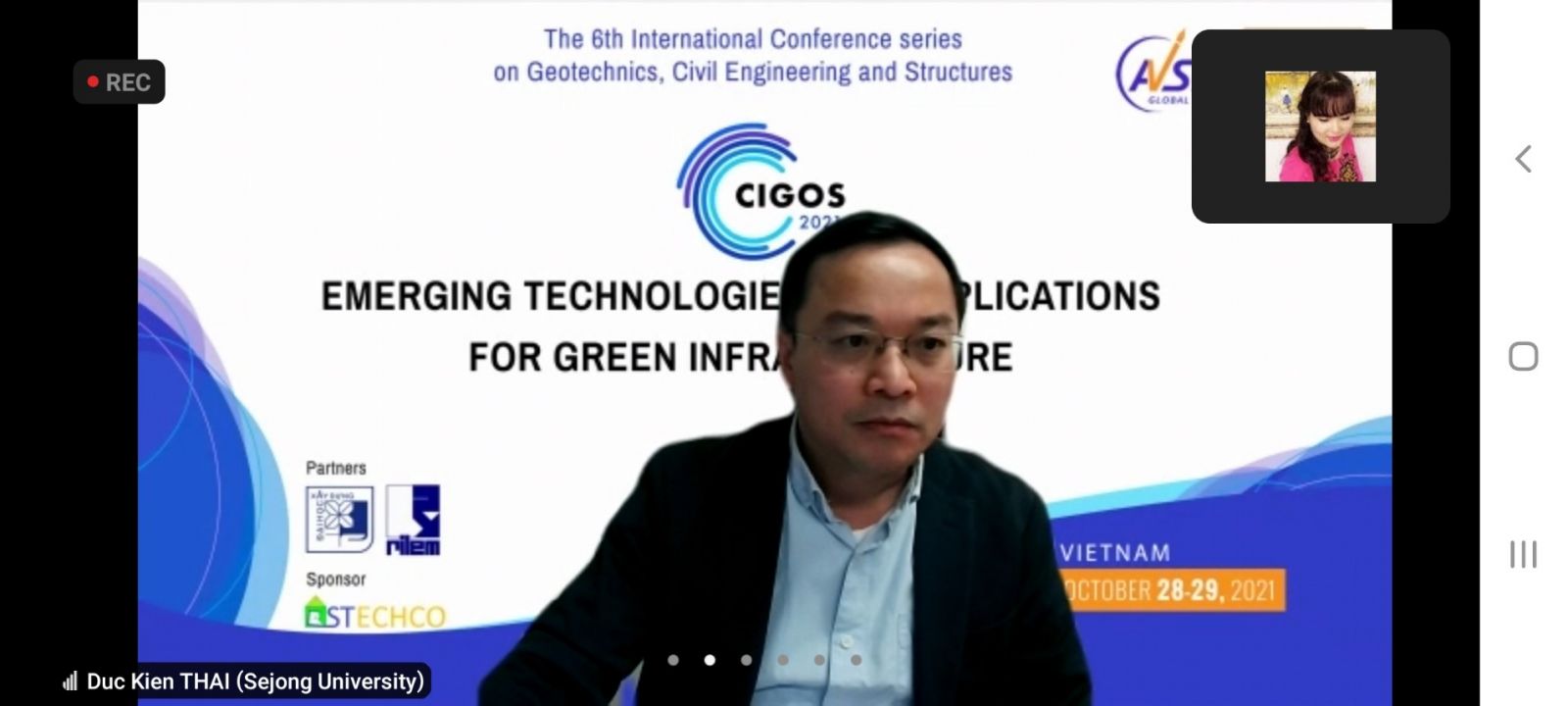 Tham dự Lễ khai mạc trực tuyến, về phía đơn vị đồng tổ chức Hội nghị có GS. TS. Nguyễn Đức Khương- Chủ tịch Hội Khoa học và Chuyên gia Việt Nam toàn cầu (AVSE- Global), TS Tăng Anh Minh, Giám đốc nghiên cứu AVSE-Global, TS Hà Minh Cường, Giám đốc mạng lưới Xây dựng và Cơ khí chế tạo AVSE- Global, đồng Trưởng ban Hội nghị CIGOS 2021, TS Vũ Huỳnh Đạt Khoa, Giám đốc mạng lưới năng lượng AVSE- Global. Về phía đơn vị hợp tác khoa học của Hội nghị có PGS.TS Nguyễn Hoàng Giang, Phó hiệu trưởng Trường Đại học Xây dựng Hà Nội. Tham dự còn có các đại biểu đại diện cho các cơ quan đơn vị thuộc các bộ, ngành Trung ương; các tỉnh, thành phố; các cơ quan, tổ chức quốc tế tại Việt Nam, lãnh đạo các trường đại học, viện nghiên cứu, các doanh nghiệp của Việt Nam và quốc tế; các nhà tài trợ, các cơ quan thông tấn báo chí và đặc biệt có sự tham dự của gần 300 học giả, nhà khoa học đến từ trên 30 quốc gia và vùng lãnh thổ trên thế giới.