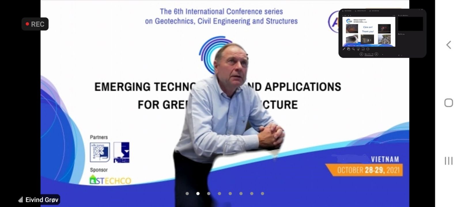 Sau Lễ khai mạc chung kết thúc, các đại biểu đã kết nối vào các phòng họp trực tuyến liên quan đến các chủ đề của Hội nghị để nghe và thảo luận các báo cáo của các diễn giả, nhà khoa học: Mô hình hóa và đặc điểm của kết cấu tiên tiến; Công ghệ và vật liệu xây dựng bền vững; Địa kỹ thuật môi trường và năng lượng; Công nghệ thông minh cho các dự án xây dựng lớn; Kiến trúc và quy hoạch cho cộng đồng bền vững; Quản lý và kinh tế xây dựng; Giao thông xanh và môi trường; Dữ liệu lớn và khai thác dữ liệu; Chuyển đổi số và internet kết nối vạn vật. (Chương trình Hội nghị xem tại đây)