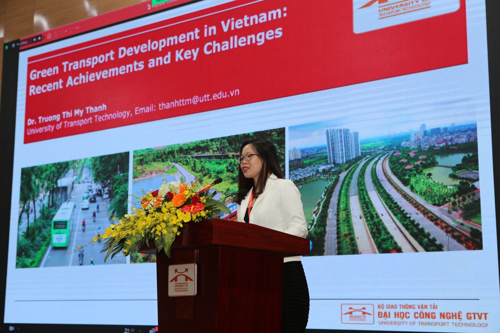 TS. Trương Thị Mỹ Thanh- Trường Đại học Công nghệ GTVT báo cáo tham luận khoa học tại Lễ khai mạc chung