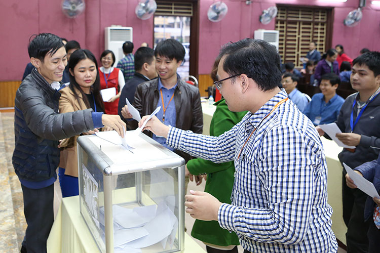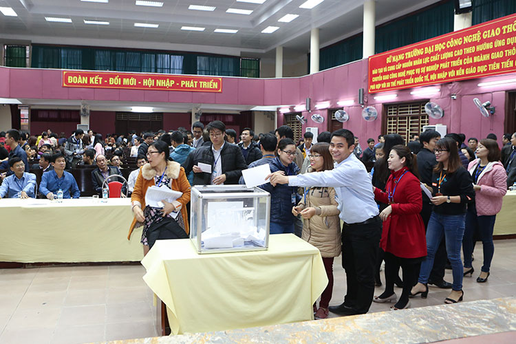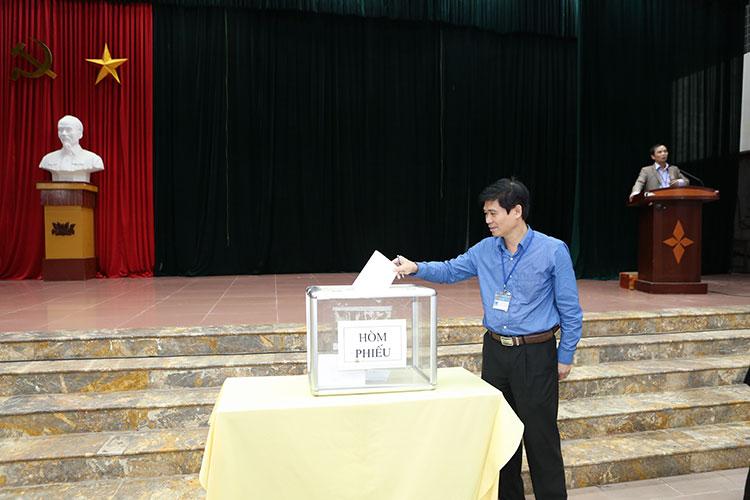 Cán bộ, viên chức, người lao động Cơ sở đào tạo Hà Nội tham gia bỏ phiếu lấy ý kiến thăm dò tại Hội nghị
