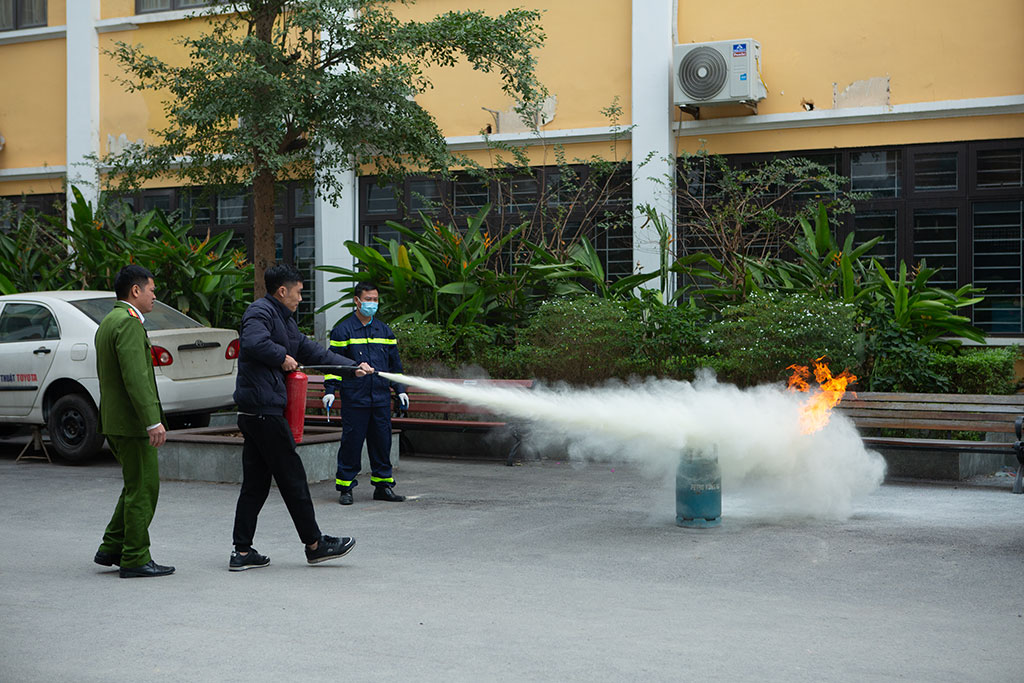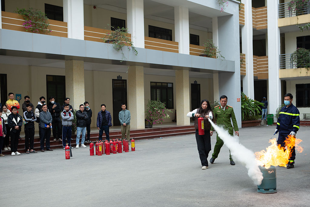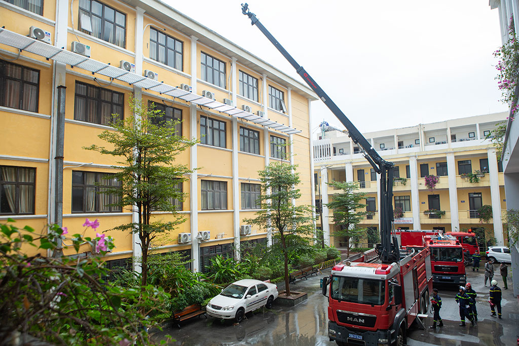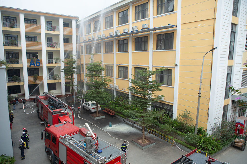 Tại khu vực Giảng đường A3, hơn 20 chiến sĩ đội cảnh sát PCCC, CNCH công an Quận Thanh Xuân cùng 03 xe cứu hỏa chuyên dụng đã được huy động tham gia diễn tập phương án chữa cháy. Các cán bộ, viên chức, người lao động và các em sinh viên của Trường cũng tham gia trực tiếp vào tình huống diễn tập theo sự hướng dẫn của lực lượng chức năng.