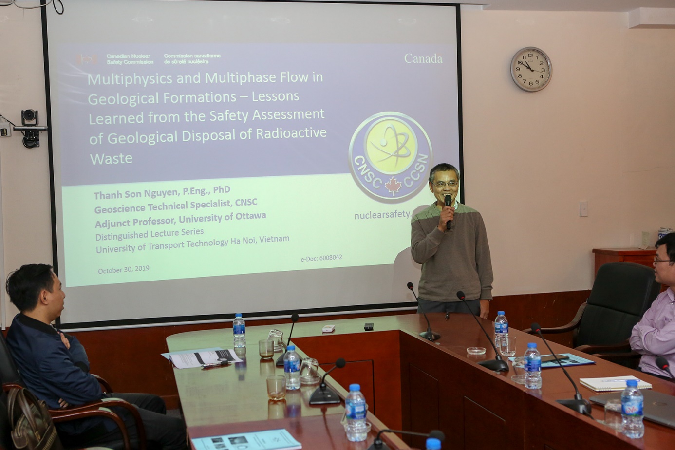 Với kinh nghiệm lâu năm là chuyên gia trong lĩnh vực địa chất và khí thải phóng xạ, GS. Thanh-Son Nguyen mang tới hội thảo chủ đề «Modelling of Multiphysics and multiphase processes in geological formations- Lessons learned from the safety assessment of geological disposal of radioactive waste”. Bài giới thiệu đã giúp người nghe hiểu rõ hơn về nguyên lý tính toán các mô hình đa vật lý “multiphysics’ và đa pha “multi phases” áp dụng trong thiết kế và phân tích các bể chứa chất thải hạt nhân nằm sâu trong lòng đất.