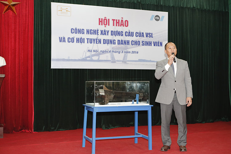 Sau bài giới thiệu về các công nghệ xây dựng cầu của Công ty VSL, bà Chu Việt Nga - Trưởng phòng nhân sự của VSL đã có bài phát biểu với các bạn sinh viên về cơ hội tuyển dụng việc làm tại công ty VSL. Giúp các bạn sinh viên sẽ có cách nhìn tổng quát hơn về hoạch định nghề nghiệp trong tương lai, đồng thời có thêm các cơ hội học tập và tiếp cận với các công nghệ KHCN tiên tiến tại Công ty VSL, nhờ đó phát triển và thành công hơn trên con đường sự nghiệp của mình.