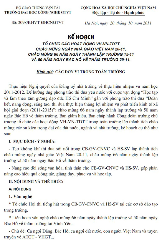 Kế hoạch tổ chức các hoạt động VH-VN-TDTT chào mừng ngày NGVN 20-11, 66 năm ngày thành lập trường và 50 năm ngày Bác Hồ về thăm trường