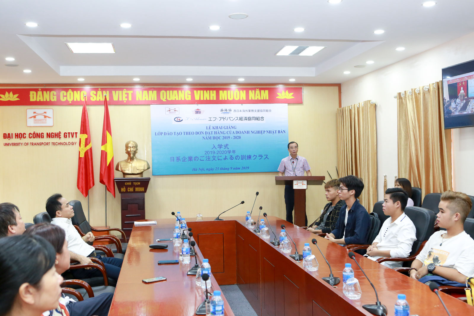Phát biểu tại Lễ Khai giảng, PGS.TS. Vũ Ngọc Khiêm- Phó Hiệu trưởng Nhà trường chào mừng đoàn công tác của doanh nghiệp Nhật Bản và giới thiệu với các doanh nghiệp Nhật Bản về định hướng phát triển của Trường Đại học Công nghệ Giao thông vận tải, chia sẻ về hoạt động đào tạo, nghiên cứu và cho biết Trường Đại học Công nghệ GTVT có nhiều chương trình đào tạo phù hợp với các yêu cầu tuyển dụng của doanh nghiệp Nhật Bản, cũng như Trường Đại học Công nghệ GTVT luôn chú trọng tới việc đào tạo nâng cao trình độ, chuyên môn và ngoại ngữ cho sinh viên. PGS.TS. Vũ Ngọc Khiêm tin tưởng rằng các tân sinh viên K70 lớp chuẩn Nhật ngoài việc nâng cao trình độ chuyên môn, trình độ ngoại ngữ, kỹ năng mềm, kỹ năng đội nhóm thì Nhà trường hợp tác với Doanh nghiệp Nhật Bản sẽ là cơ hội cho các em sinh viên có điều kiện rèn luyện tốt hơn về kỹ năng ngoại ngữ, thái độ làm việc. Cuối cùng, PGS.TS. Vũ Ngọc Khiêm thay mặt Lãnh đạo Nhà trường, thay mặt tập thể sư phạm Trường Đại học Công nghệ GTVT cảm ơn sự quan tâm, sự hợp tác của các doanh nghiệp Nhật đã và đang đồng hành cùng với Nhà trường và sinh viên Trường Đại học Công nghệ GTVT để chinh phục những thách thức mới là đào tạo nguồn nhân lực chất lượng cao cho xã hội.