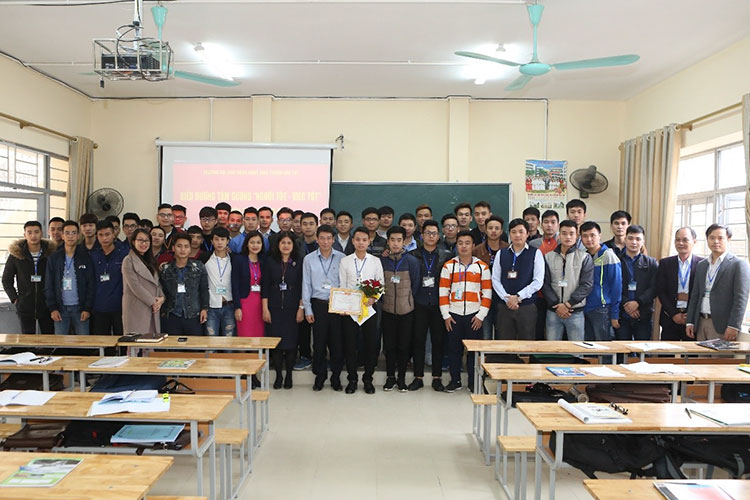 Các thầy cô giáo và sinh viên lớp 65DCCD22, Khoa Công trình chụp ảnh lưu niệm chúc mừng sinh viên Phạm Đình Quý