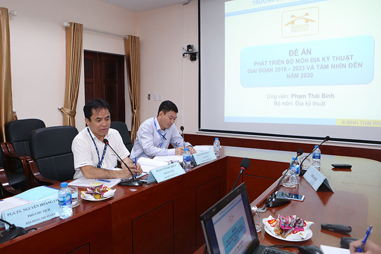 Ngay sau phần khai mạc, từng thí sinh đã lần lượt bảo vệ Đề án "Phát triển Bộ môn Địa kỹ thuật giai đoạn 2018-2023 và tầm nhìn đến năm 2030" theo cách nhìn của mình và trả lời các câu hỏi của các thành viên trong Hội đồng thi tuyển. Theo đánh giá của Hội đồng thi tuyển, các thí sinh đã có sự chuẩn bị công phu, trình bày khoa học, sáng tạo, trả lời các câu hỏi của Hội đồng đầy đủ, chính xác, phù hợp với nội dung theo quy định, được các thành viên Hội đồng đánh giá cao. Hội đồng thi tuyển đã thảo luận, thống nhất và quyết định điểm thi bảo vệ đề án của TS. Phạm Thái Bình và TS. Hồ Sĩ Lành lần lượt là 88.36 và 84.55 điểm.