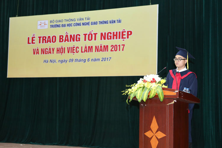 Trong niềm vui ngày tốt nghiệp, đại diện cho các tân kỹ sư, tân cử nhân, sinh viên Phạm Công Tú - K63 ngành CNKT Xây dựng Cầu đường bộ đã phát biểu bày tỏ lòng biết ơn sâu sắc tới Ban lãnh đạo Nhà trường, các thầy cô đã tận tâm truyền đạt cho các em những kiến thức, kỹ năng cần thiết trong suốt quá trình học tập và xin hứa sẽ đem những kiến thức đã học, vận dụng sáng tạo vào công việc và cuộc sống để khỏi phụ lòng mong đợi của thầy cô, để xứng đáng với những gì thầy cô đã dạy dỗ, xứng đáng với truyền thống của các thế hệ sinh viên Trường Đại học Công nghệ GTVT.