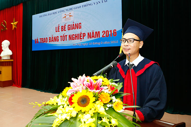 Trong niềm vui ngày tốt nghiệp, đại diện cho các tân cử nhân, tân kỹ sư, Em Đỗ Văn Huấn lớp 62DCCD03, Khoa Công trình đã phát biểu và bày tỏ lòng biết ơn sâu sắc tới Ban lãnh đạo nhà trường, các thầy cô giáo đã tận tâm truyền đạt cho các em những kiến thức, kỹ năng cần thiết trong suốt quá trình học tập và xin hứa sẽ đem những kiến thức đã học, vận dụng sáng tạo vào công việc và cuộc sống để không phụ lòng mong đợi của thầy cô, để xứng đáng và những gì thầy cô đã dạy dỗ, xứng đáng với truyền thống của các thế hệ sinh viên Trường Đại học Công nghệ GTVT. Huấn bày tỏ "Ngày hôm nay khi đã hoàn thành chương trình của khoá học, được công nhận tốt nghiệp và được vinh dự khoác trên mình bộ lễ phục cử nhân của Trường Đại học Công nghệ GTVT, chúng em cảm thấy tự hào, vui mừng và xúc động, chúng em luôn luôn ghi nhớ công lao của các thầy các cô, người đã cho chúng em những kiến thức, những kinh nghiệm quý báu để làm hành trang cho sự nghiệp sau này".