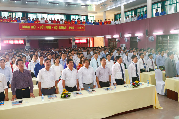 Các đại biểu, khách mời cùng toàn thể lãnh đạo, cán bộ, giảng viên, sinh viên Nhà trường thực hiện nghi thức chào cờ và hát Quốc ca tại Lễ khai giảng năm học 2016 - 2017