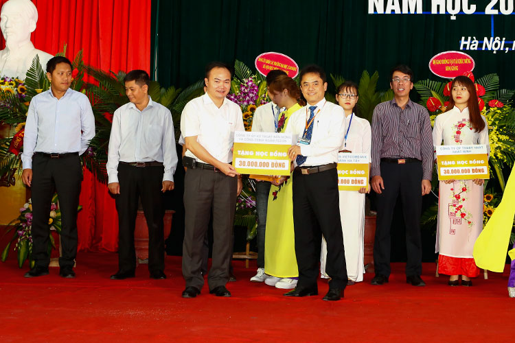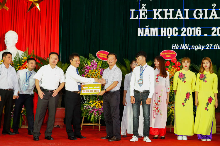 TS. Vũ Ngọc Khiêm - Phó Bí thư Đảng uỷ, Phó Hiệu trưởng thay mặt Nhà trường nhận các suất học bổng từ các nhà tài trợ dành cho sinh viên Trường