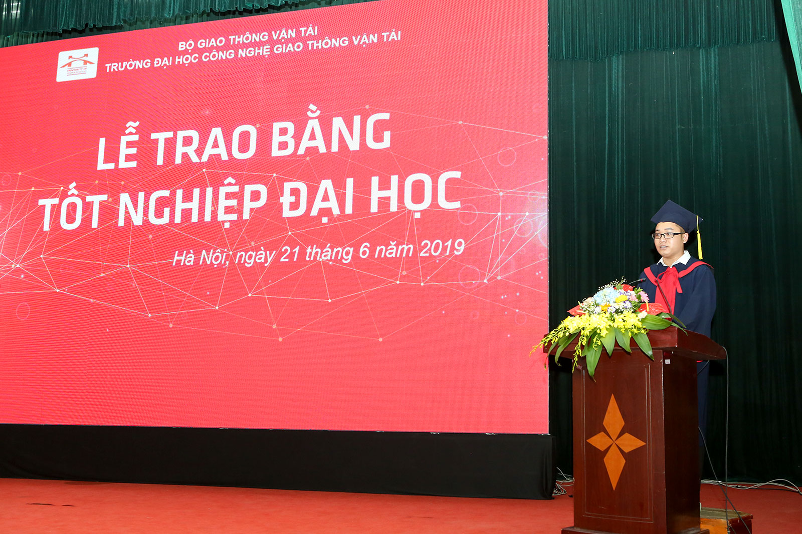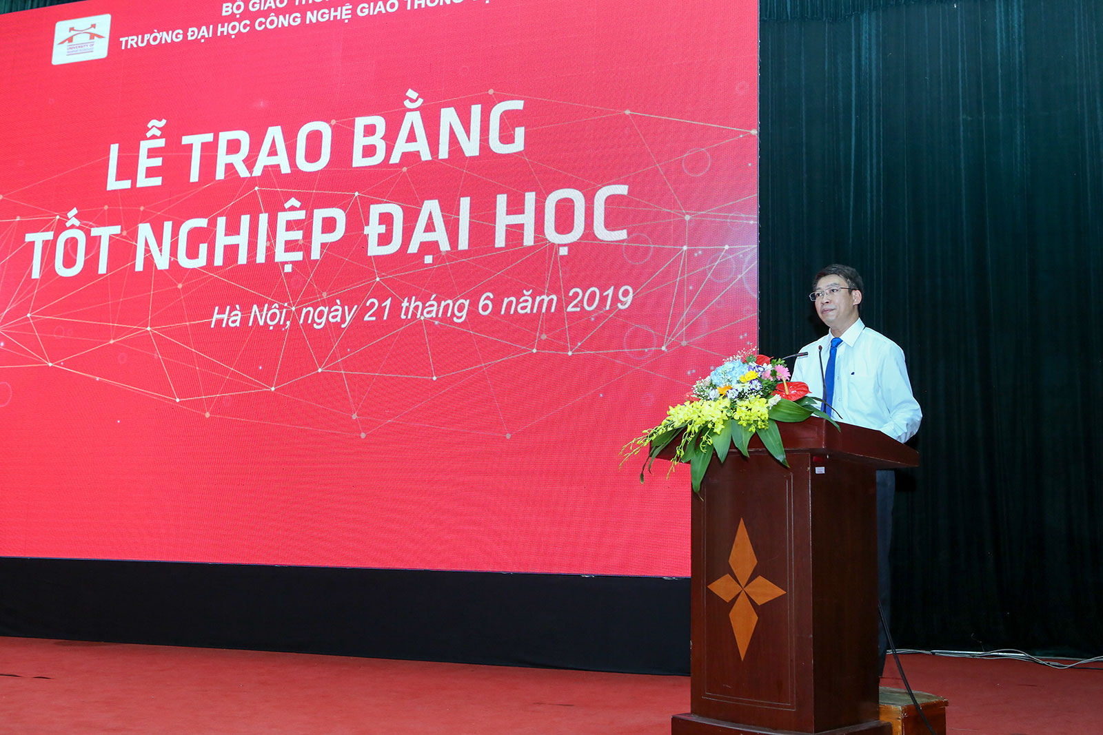 Phát biểu tại buổi Lễ, PGS.TS. Đào Văn Đông - Hiệu trưởng Nhà trường vui mừng và tự hào được vinh danh 645 gương mặt tân kỹ sư, cử nhân ở cả 3 cơ sở đào tạo Hà Nội, Vĩnh Phúc và Thái Nguyên của Trường Đại học Công nghệ GTVT vừa tốt nghiệp đã hoàn thành xuất sắc chương trình đào tạo, tích lũy kiến thức, kỹ năng trước khi tham gia vào thị trường lao động trong nước và quốc tế. Trường Đại học Công nghệ GTVT với truyền thống 74 năm của Ngành GTVT sẽ mãi là ngôi nhà thứ hai của các cựu sinh viên và luôn rộng mở đón chào học ở những bậc học cao hơn, hay đơn giản là để tìm lại những kỷ niệm của một thời sinh viên sôi nổi, nhiều ước mơ hoài bão. Tâm sự với các sinh viên trước khi thầy trò tạm chia tay, Thầy nói: " Những năm học qua, Nhà trường, các thày cô và cá nhân thày đã cố gắng giành những gì tốt đẹp nhất cho các em. Nhưng, kiến thức và kỹ năng thày cô truyền đạt đến các em mới chỉ là nền tảng, chưa thể đầy đủ và chi tiết cho đòi hỏi của cuộc sống hôm nay. Những phòng học còn chưa khang trang, còn đổ mô hôi trong những ngày hè nóng nực chưa thể là điều kiện tốt nhất để thày và trò tập trung cho bài giảng. Hay, đơn giản chỉ với chuẩn đầu ra ngoại ngữ tiếng Anh tương đương Toeic 450 điểm chưa phải đã thỏa mãn yêu cầu của sự hội nhập quốc tế đang đặt ra. Nhưng thày tin ở các em. Khó khăn của ngày hôm nay sẽ là tiền đề để các em vươn lên tạo lập những gì tốt đẹp hơn cho chính các em, cho gia đình và cộng đồng xã hội. Thày tin ở hoài bão lớn của mỗi em. Thày tin, các em sẽ là những cá nhân mạnh mẽ hơn, quyết tâm hơn, bản lĩnh hơn, trí tuệ hơn chính thày để dám nghĩ lớn và làm lớn để xây dựng đất nước ta ngày càng giàu mạnh hơn. Các em hãy đến với những thày cô của mình để thêm một lần nói lời tri ân những người đã giành trọn trí tuệ và tâm huyết cho các em những năm tháng vừa qua. Các em hãy giành thời gian để về với gia đình, để thêm một lần nói lời cảm ơn đấng sinh thành đã giành tất cả tình cảm và tiền bạc nuôi dưỡng hoài bão thành tài của các em hơn 4 năm qua".