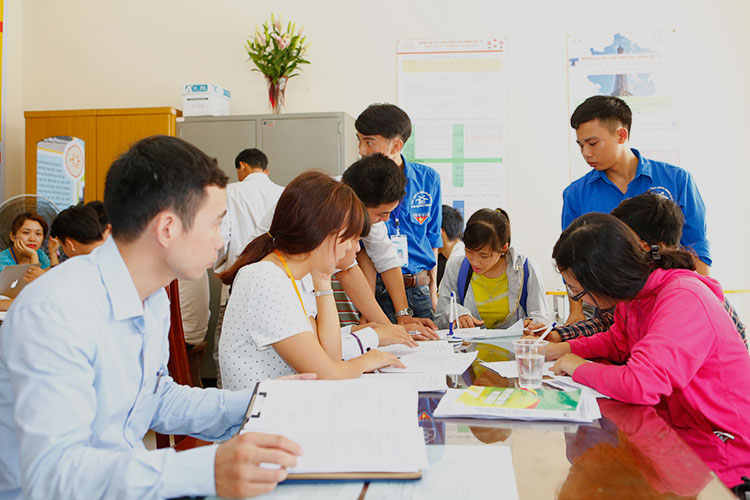 Đội ngũ tình nguyện viên của Trường hoạt động rất năng động và nhiệt tình hỗ trợ các thí sinh