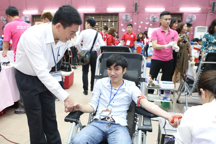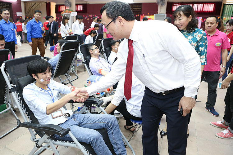 Đồng chí Khuất Viết Hùng bắt tay, cảm ơn các bạn trẻ ngành GTVT, đặc biệt sinh viên Trường Đại học Công nghệ GTVT đã hưởng ứng mạnh mẽ và tham gia ngày hội hiến máu tình nguyện năm 2017