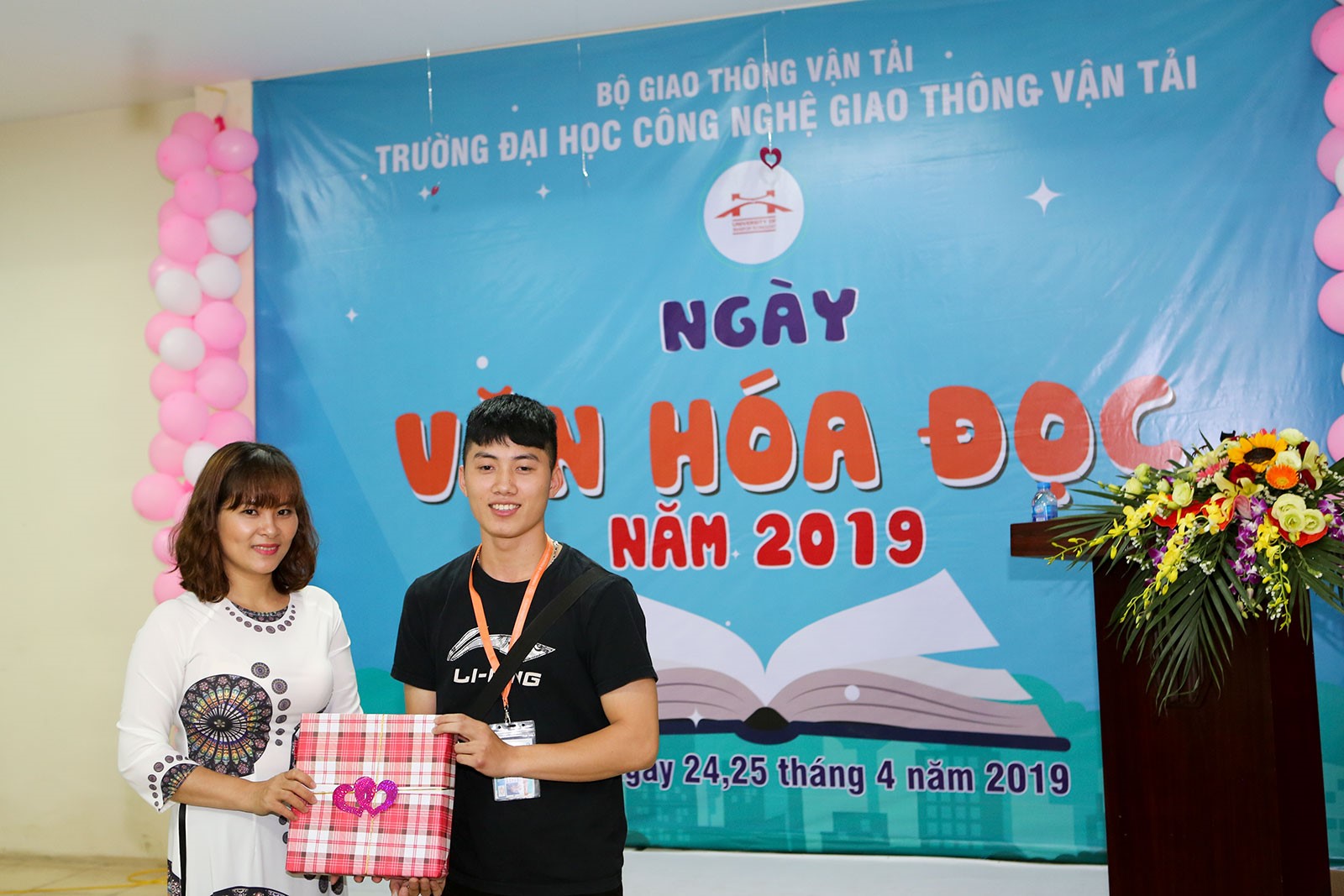 Đại diện Trung tâm Công nghệ thông tin - Thư viện trao quà cho độc giả may mắn bốc thăm trúng thưởng