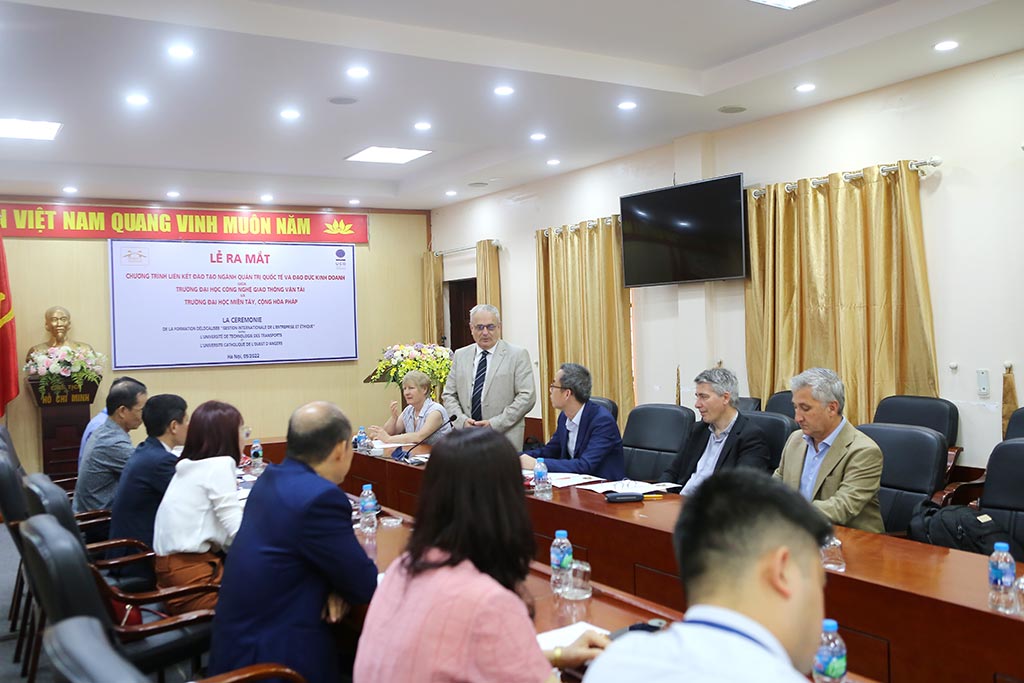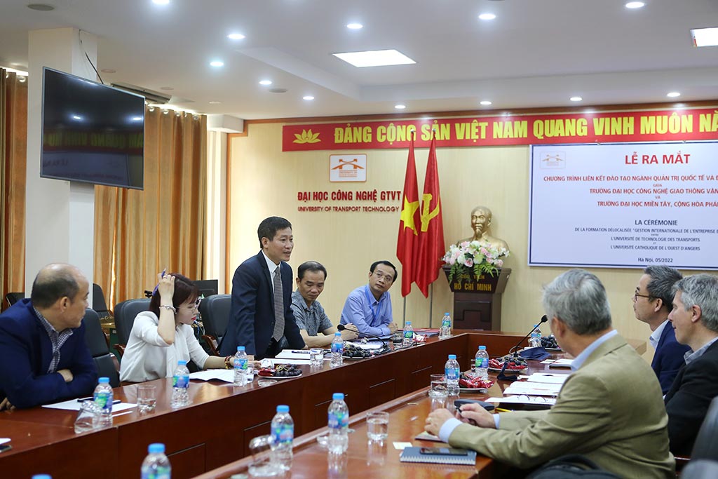 Ngày 19/05/2022, Trường Đại học Công nghệ GTVT và Trường Đại học Công giáo miền Tây Angers (Cộng hòa Pháp) đã long trọng tổ chức Lễ ra mắt Chương trình liên kết đào tạo ngành “Quản trị quốc tế và đạo đức trong kinh doanh” nhân chuyến thăm và làm việc của lãnh đạo Trường Đại học Công giáo miền Tây tại Hà Nội.