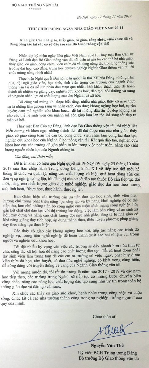 Thư chúc mừng ngày Nhà giáo Việt Nam của Bộ trưởng Bộ GTVT