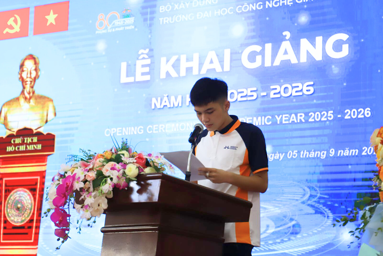 Đại diện tân sinh viên K76, sinh viên Hoàng Minh Quân lớp K76DCOT11 đã có bài phát biểu bày tỏ niềm vinh dự, tự hào khi được trở thành thành viên của UTT, đồng thời thể hiện quyết tâm học tập, rèn luyện để đóng góp vào sự phát triển chung của Nhà trường.
