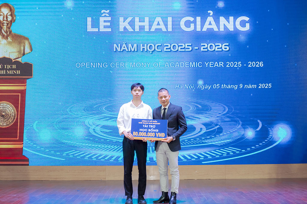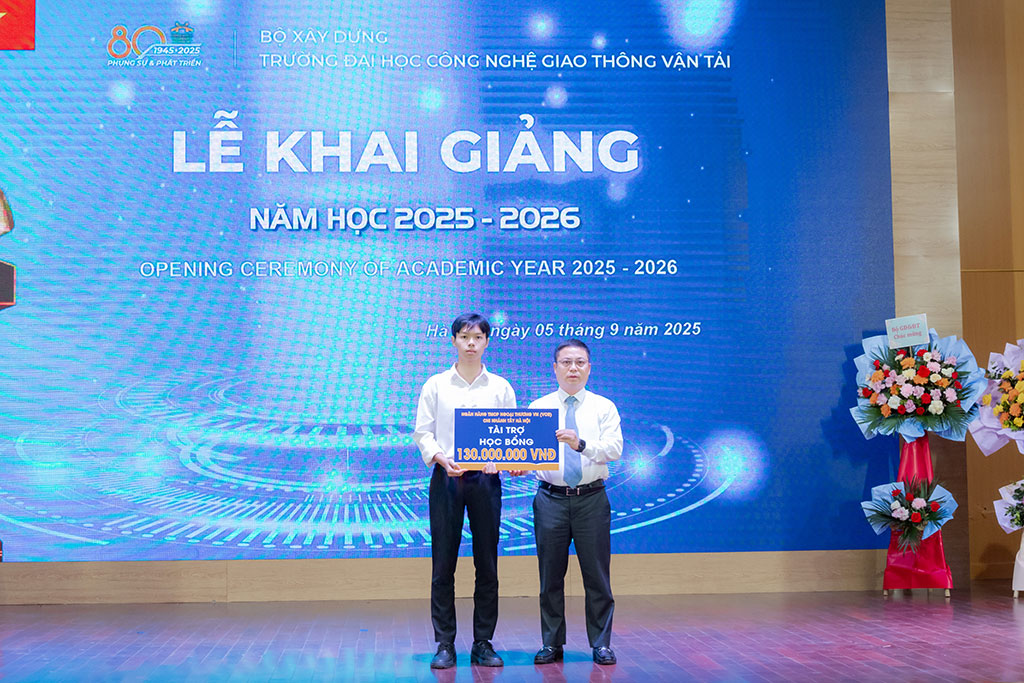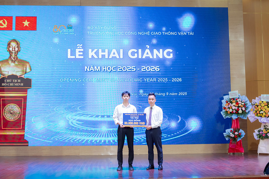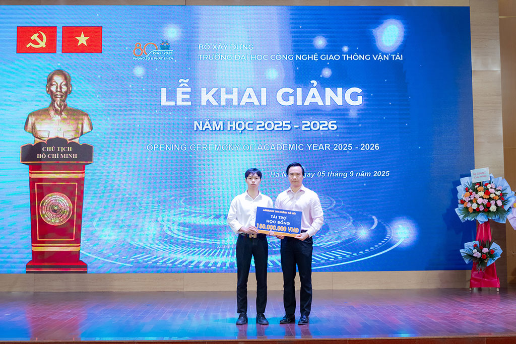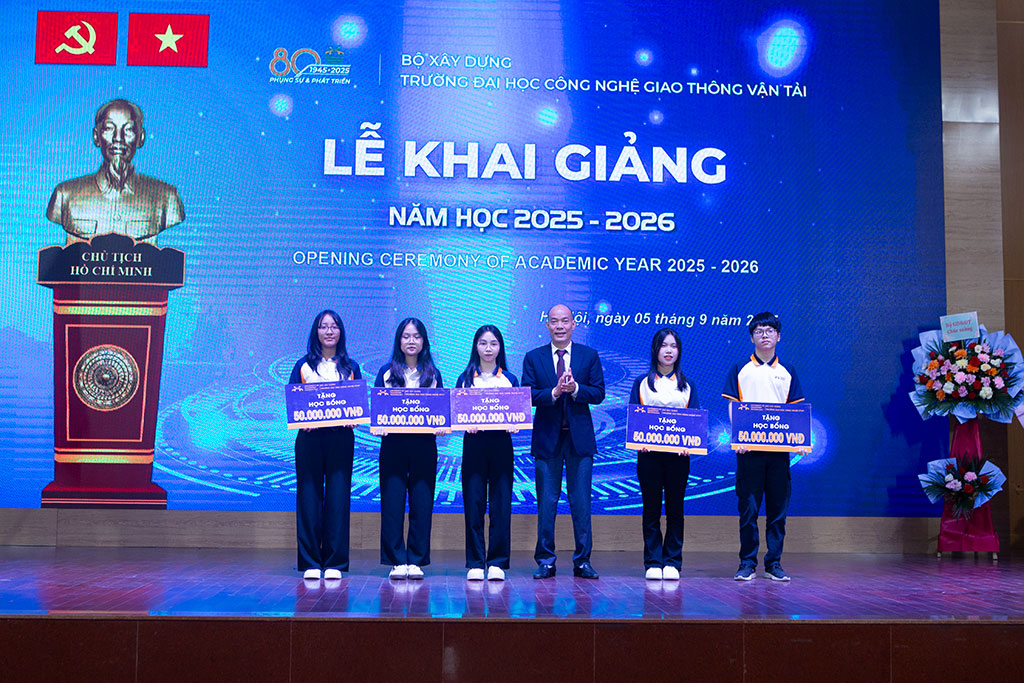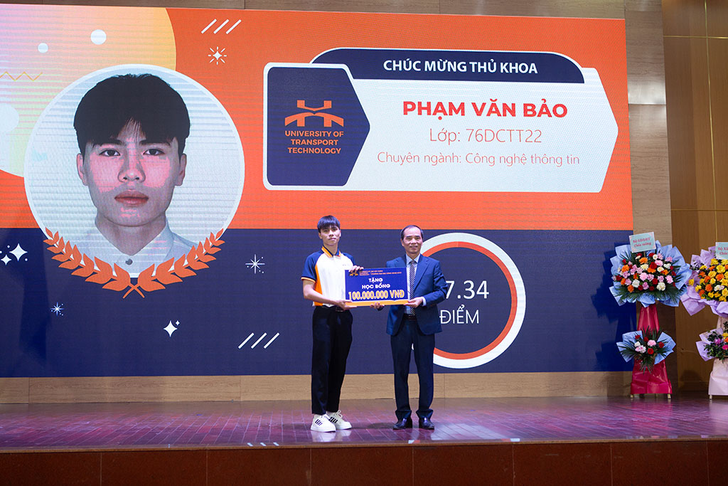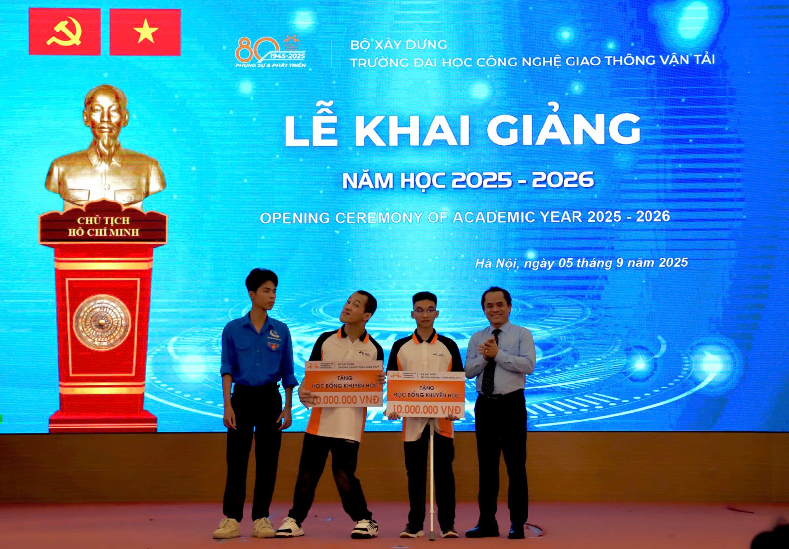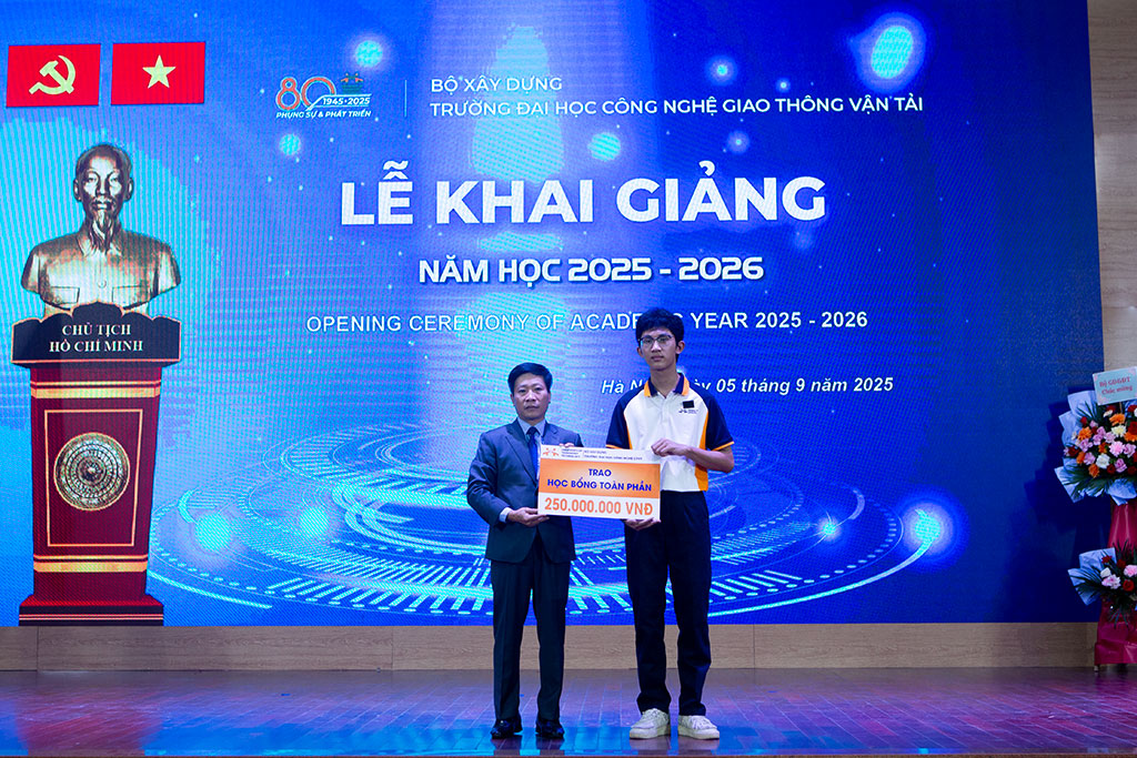 Đặc biệt, tại buổi lễ, Nhà trường đã trao tặng học bổng toàn phần tổng giá trị 250 triệu đồng cho em Nguyễn Hữu Phước, tân sinh viên chuyên ngành Trí tuệ nhân tạo và giao thông thông minh. Em có hoàn cảnh đặc biệt khi đã không may bị mất cả bố mẹ, chị và em gái trong vụ tai nạn lật tàu thương tâm tại vịnh Hạ Long vào tháng Bảy vừa qua nhưng đã vượt qua nghịch cảnh để bước vào mái nhà chung UTT. Đây là sự chia sẻ và động viên kịp thời, tiếp thêm niềm tin, ý chí và khát vọng cho em trên con đường tri thức. Bên cạnh đó, nhằm khích lệ tinh thần học tập và rèn luyện, Nhà trường cũng trao học bổng cho Thủ khoa, Á khoa đầu vào năm học 2025-2026.