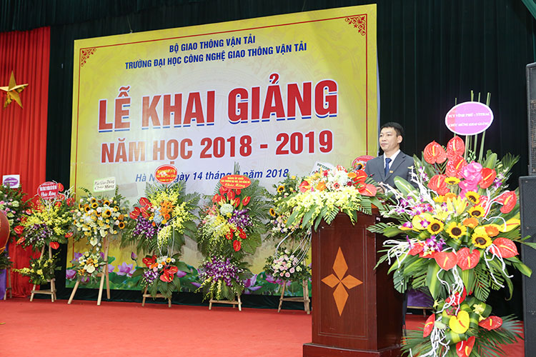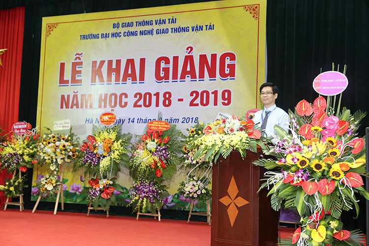 Thay mặt Đảng uỷ, Ban Giám hiệu Nhà trường, PGS.TS. Đào Văn Đông - Bí thư Đảng uỷ, Hiệu trưởng Nhà trường đã phát biểu khai giảng năm học mới, trong đó khái quát những thuận lợi và khó khăn trước thềm năm học mới đối với thầy và trò Nhà trường. PGS.TS. Đào Văn Đông nhắn nhủ tới các em sinh viên, tân sinh viên rằng “Thế giới đã có những bước tiến dài trong kỷ nguyên của công nghệ gắn liền với cuộc cách mạng công nghiệp 4.0. Việt Nam cũng đang tranh thủ cơ hội vàng để hội nhập cùng dòng chảy của cuộc Cách mạng này. Nhưng chúng ta có thành công hay không, có xây dựng được một nền kinh tế số và một xã hội điện tử hay không, phụ thuộc rất nhiều vào chính các em. Các em đã là sinh viên của một trường đại học đi đúng theo hướng công nghệ - Trường ĐH Công nghệ GTVT. Vậy, các em hãy nắm lấy cơ hội và khai thác hiệu quả tính công nghệ trong mỗi chuyên ngành các em theo học để phù hợp với xu hướng X-tech ngày nay. Mỗi em hãy quyết tâm học tập và rèn luyện để Chuyên nghiệp và bền bỉ hơn Robot, Thông minh hơn trí tuệ nhân tạo, Hiểu biết rộng hơn internet vạn vật, và Xử lý công việc nhiều hơn big data".