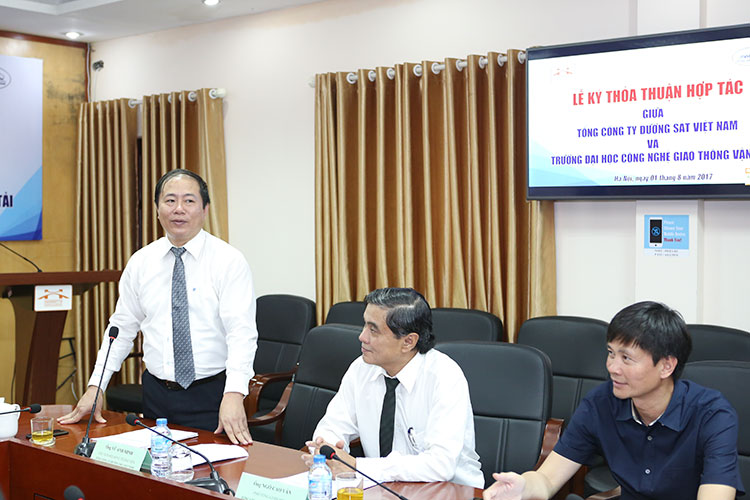 Phát biểu tại buổi lễ, ông Vũ Anh Minh - Chủ tịch Hội đồng thành viên VNR cảm ơn và đánh giá cao thỏa thuận hợp tác với Trường Đại học Công nghệ GTVT. Ông Vũ Anh Minh cho biết ngày 16/6 vừa qua, Chính phủ đã thông qua Luật Đường sắt sửa đổi tạo tiền đề phát triển đường sắt trong tương lai, qua đó mong muốn hợp tác với UTT đào tạo nguồn nhân lực chất lượng cao phù hợp với yêu cầu và nhu cầu của Tổng công ty. Ông Vũ Anh Minh cũng bày tỏ mong muốn, trong thời gian tới Trường Đại học Công nghệ GTVT tiếp tục có những chương trình đào tạo, đào tạo lại thích hợp, hiệu quả dành cho Tổng công ty ĐSVN để đáp ứng yêu cầu ngày càng cao của quá trình hội nhập và hiện đại hóa ngành đường sắt ở Việt Nam.